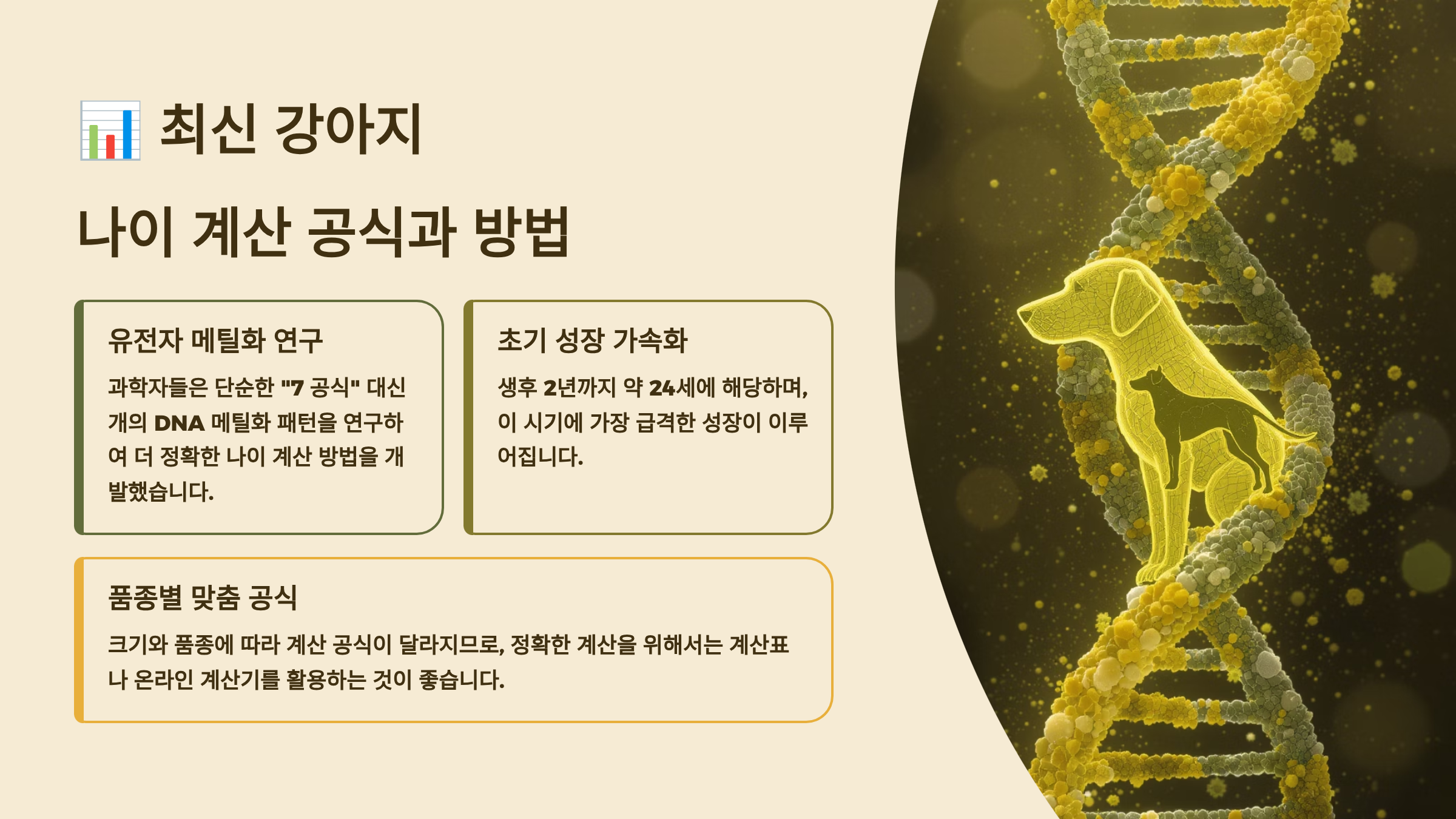 2019년 미국 캘리포니아 대학 연구팀은 DNA 메틸화 패턴을 분석해 더욱 정확한 강아지 나이 계산 공식을 개발했어요. 이 연구에 따르면 강아지 나이를 사람 나이로 환산하는 공식은 '인간 나이 = 16 × ln(강아지 나이) + 31'이랍니다. 하지만 이 공식도 평균적인 계산이므로 개체 차이는 있을 수 있어요.
