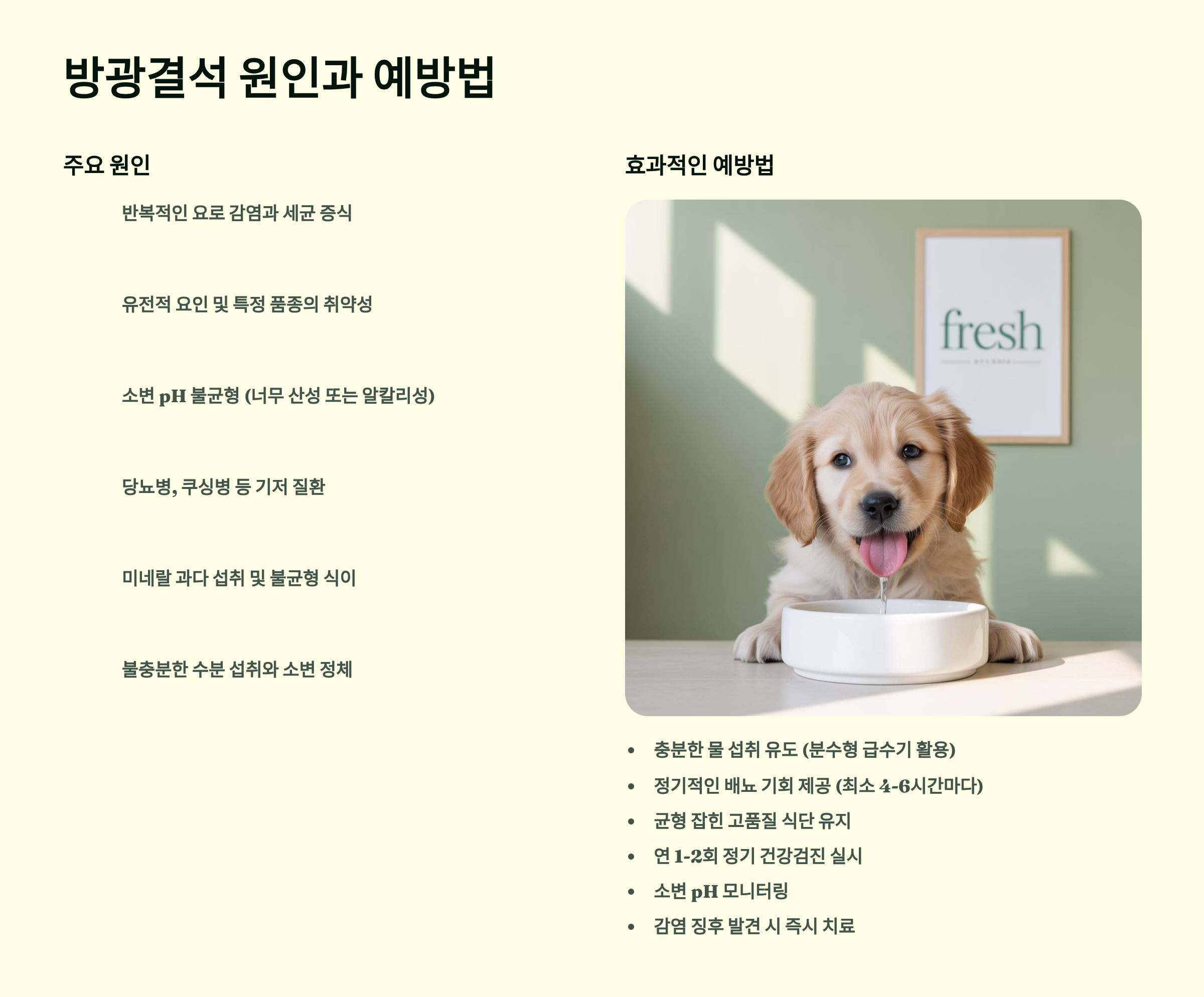 방광결석의 주요 원인은 크게 네 가지로 나눌 수 있어요. 첫째, 유전적 요인으로 시추, 요크셔테리어, 비숑프리제 같은 특정 품종이 결석에 취약해요. 둘째, 식이 요인인데 마그네슘, 인, 칼슘이 과다한 사료나 간식을 장기간 섭취하면 결석 위험이 높아져요. 셋째, 수분 섭취 부족으로 소변이 농축되면 미네랄이 쉽게 결정화돼요. 넷째, 요로 감염이 반복되면 세균이 결석 형성을 촉진한답니다.
