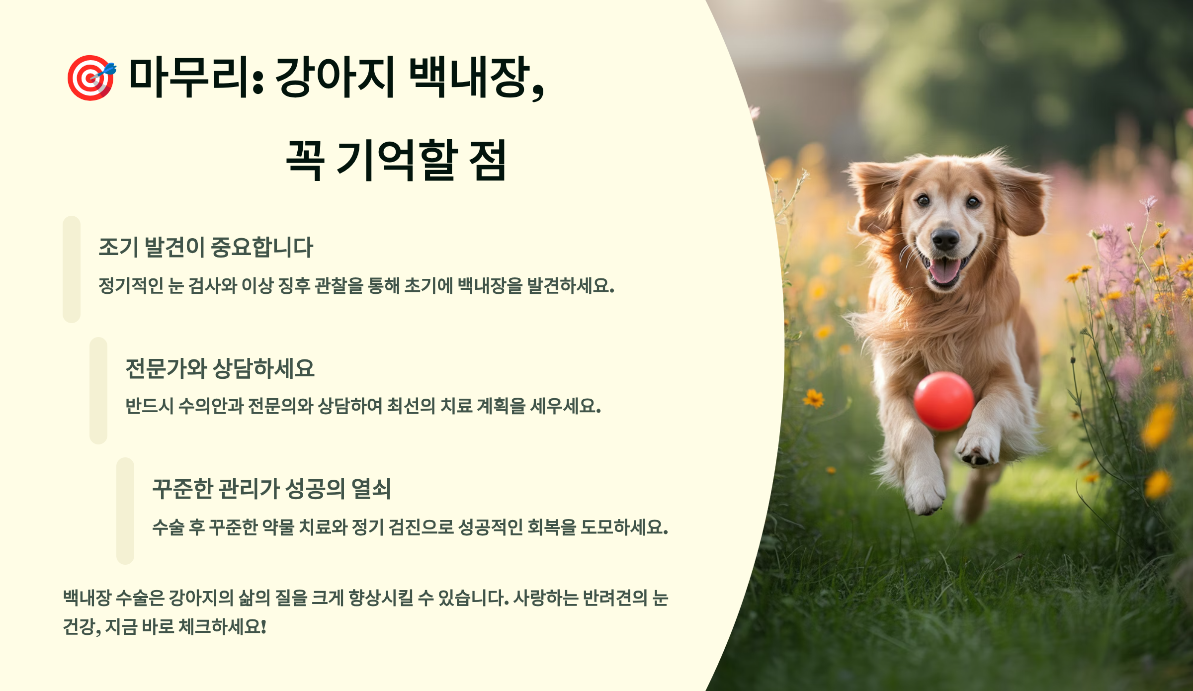 사랑하는 우리 강아지가 다시 맑은 눈으로 세상을 볼 수 있도록 용기를 내세요. 수술 후 행복해하는 강아지의 모습을 보면 그 어떤 것과도 바꿀 수 없는 기쁨을 느끼실 거예요. 모든 강아지가 건강하고 행복한 삶을 살 수 있기를 진심으로 바랍니다! 🐾💕