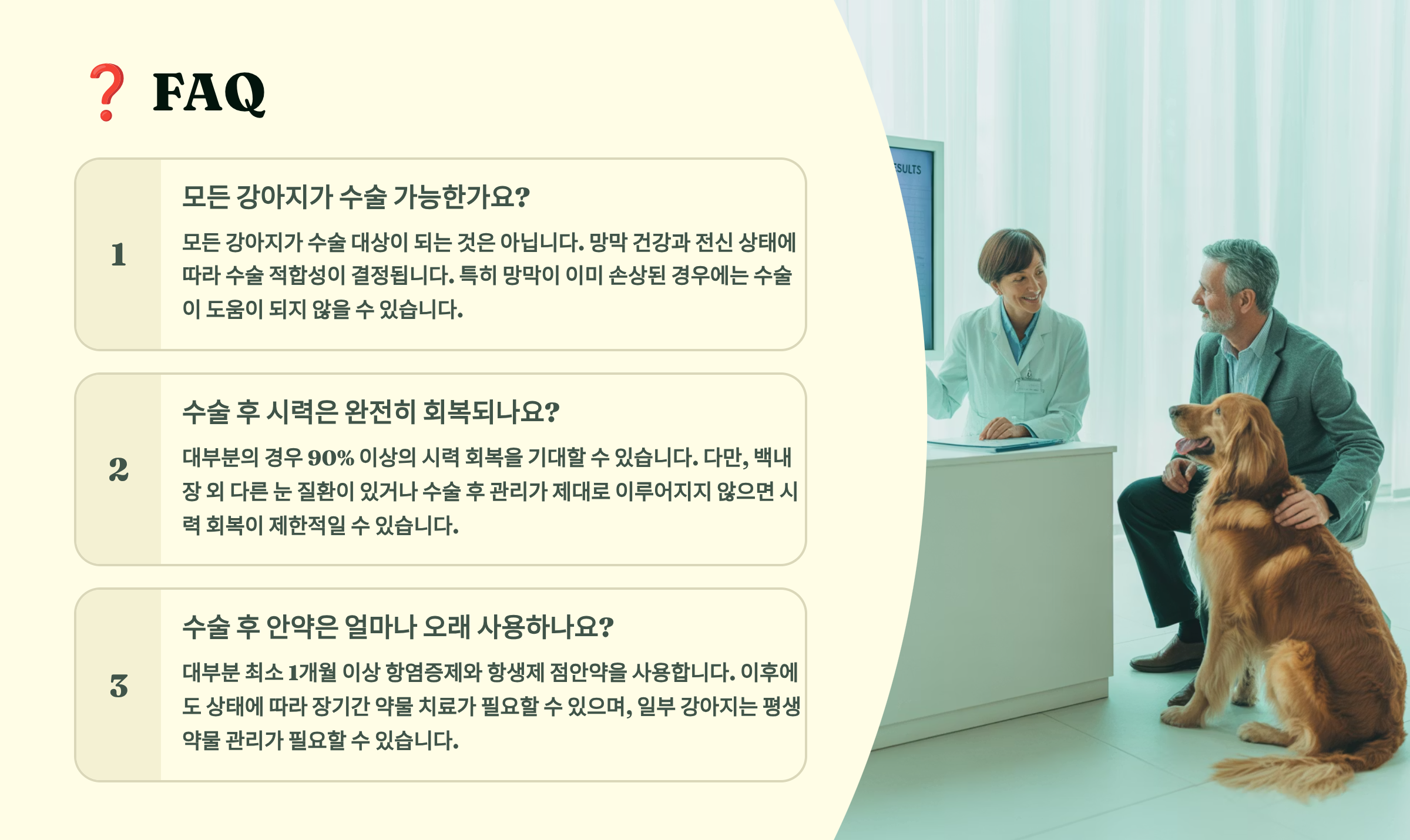 A1. 대부분의 강아지가 수술 가능하지만, 전신 마취가 가능한 건강 상태여야 해요. 수술 전 혈액검사와 심장 검사로 마취 위험도를 평가하고, 망막 상태도 확인해야 합니다. 나이보다는 전반적인 건강 상태가 더 중요해요.
