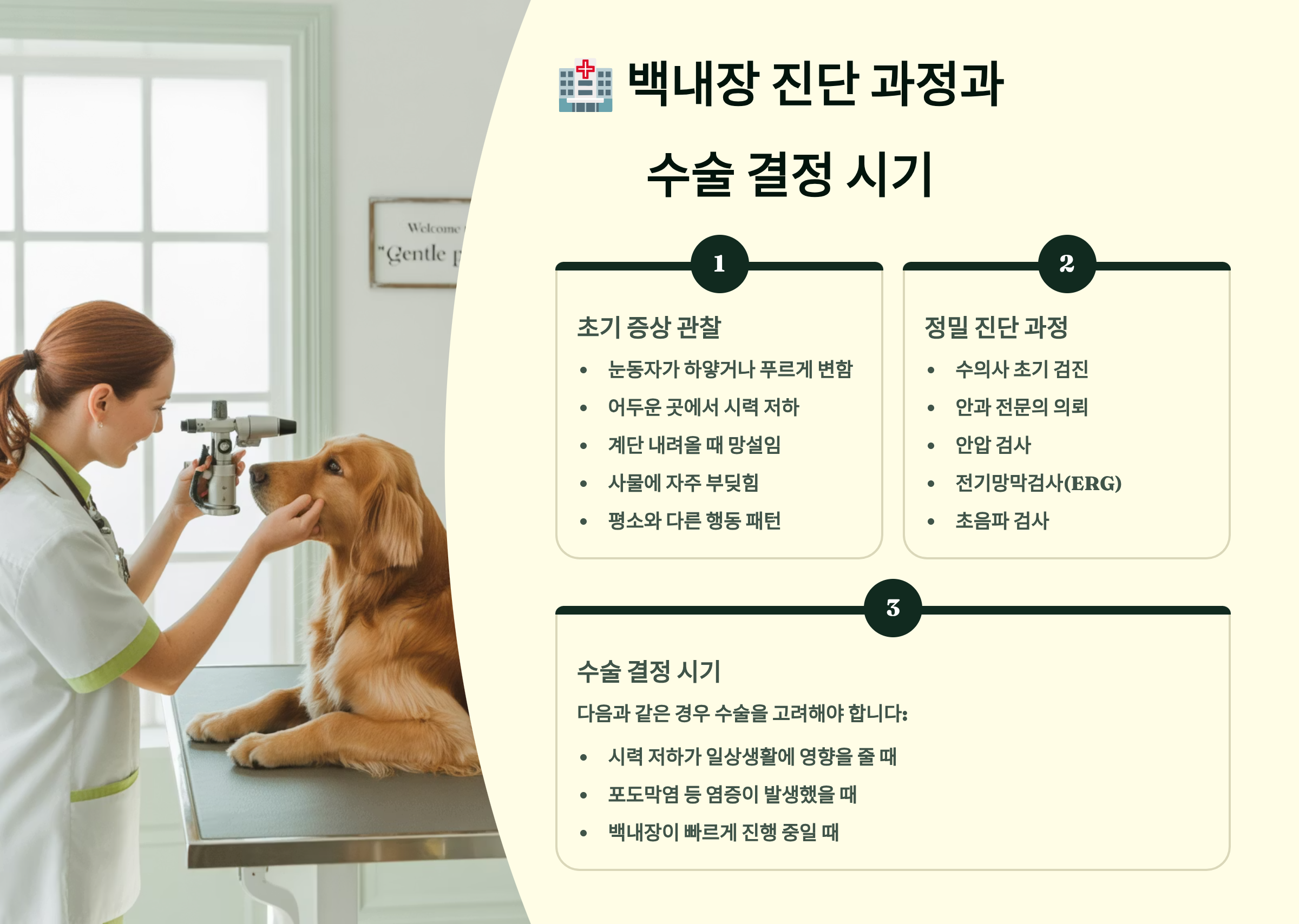 수술 시기 결정이 정말 중요해요. 너무 이르면 불필요한 수술이 될 수 있고, 너무 늦으면 합병증 위험이 높아져요. 일반적으로 시력이 50% 이상 손실되었을 때 수술을 권하는데, 강아지의 나이와 건강 상태, 생활 패턴을 종합적으로 고려해야 해요. 활동적인 강아지라면 조금 더 적극적으로 수술을 고려하는 것이 좋아요.