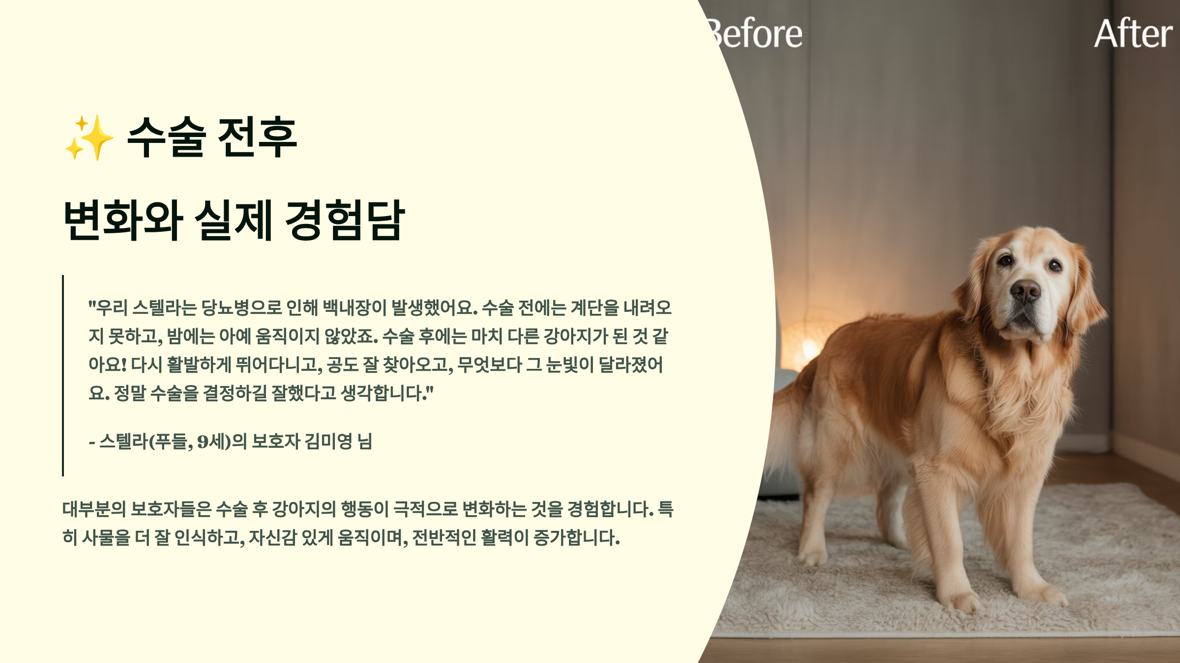 사랑하는 우리 강아지가 다시 맑은 눈으로 세상을 볼 수 있도록 용기를 내세요. 수술 후 행복해하는 강아지의 모습을 보면 그 어떤 것과도 바꿀 수 없는 기쁨을 느끼실 거예요. 모든 강아지가 건강하고 행복한 삶을 살 수 있기를 진심으로 바랍니다! 🐾💕