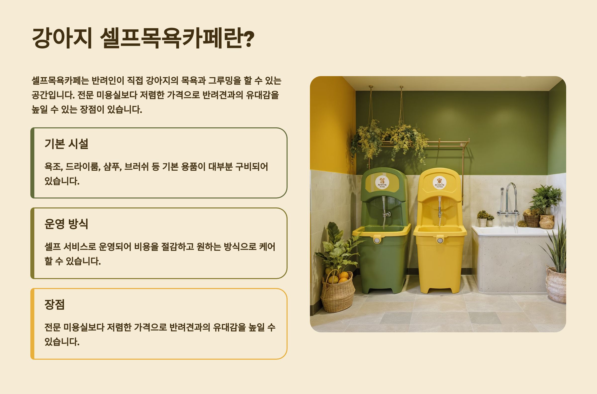 강아지 셀프목욕카페는 보호자가 직접 반려견을 목욕시킬 수 있도록 전문 시설과 도구를 제공하는 공간이에요. 2018년경부터 국내에 본격적으로 생기기 시작해서 현재는 전국 주요 도시에 200여 개 이상의 매장이 운영되고 있답니다. 일반 가정집과 달리 넓은 목욕 공간, 높낮이 조절 가능한 테이블, 전문 드라이기 등을 갖추고 있어요.