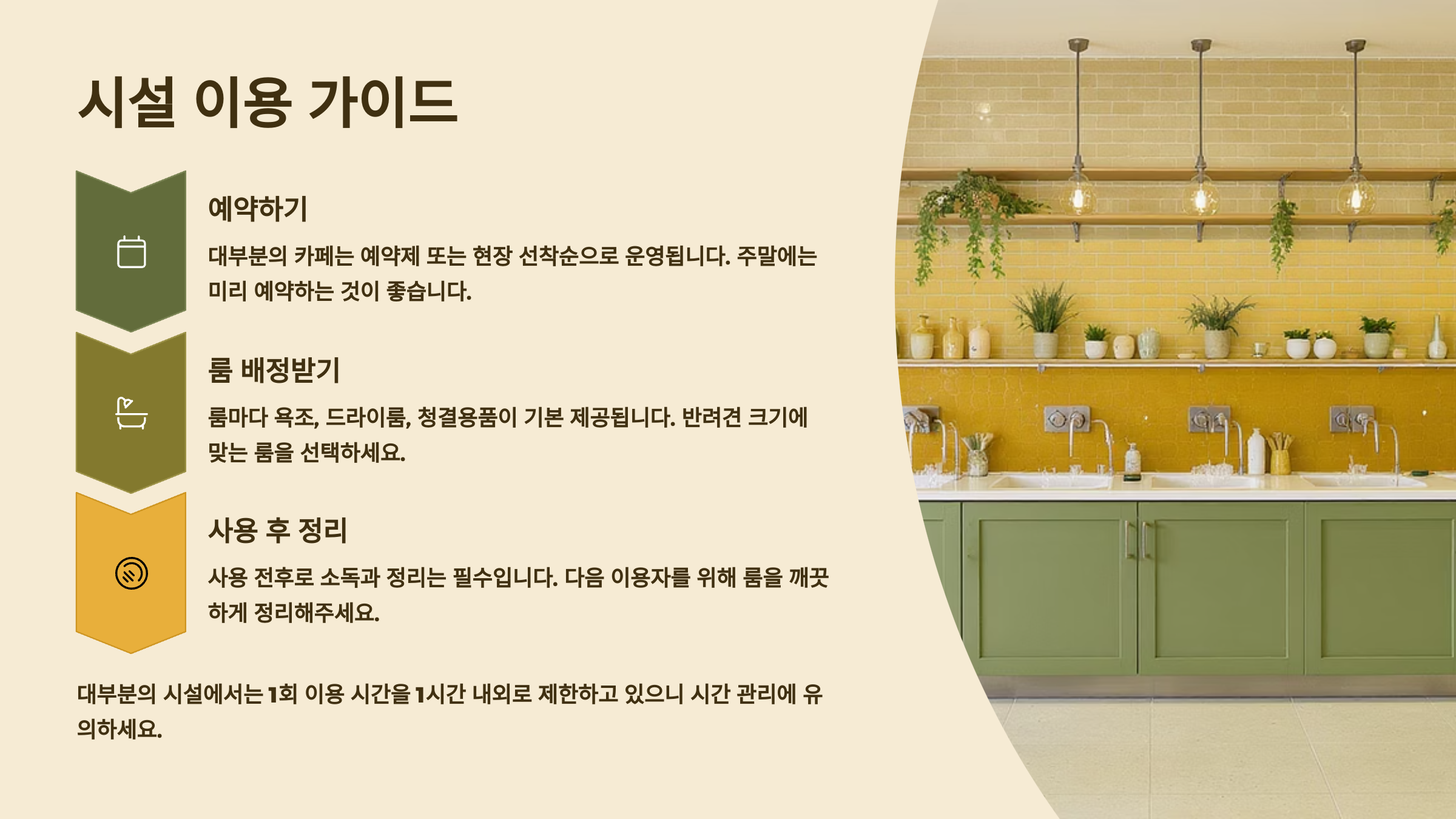 대부분의 셀프목욕카페는 시간제로 운영되며, 보통 30분에서 1시간 단위로 이용할 수 있어요. 기본 이용료에는 샴푸, 린스, 타올, 드라이기 사용이 포함되어 있고, 추가 옵션으로 탄산스파나 특수 샴푸를 선택할 수도 있답니다.