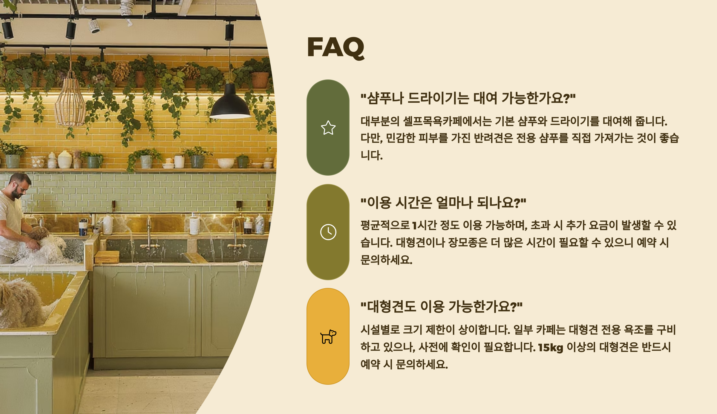 A8. 30kg 이상 대형견은 혼자서는 힘들 수 있어요. 특히 목욕을 싫어하는 강아지라면 2인 1조를 추천합니다. 일부 카페는 대형견 전용 도우미 서비스를 제공하기도 해요.