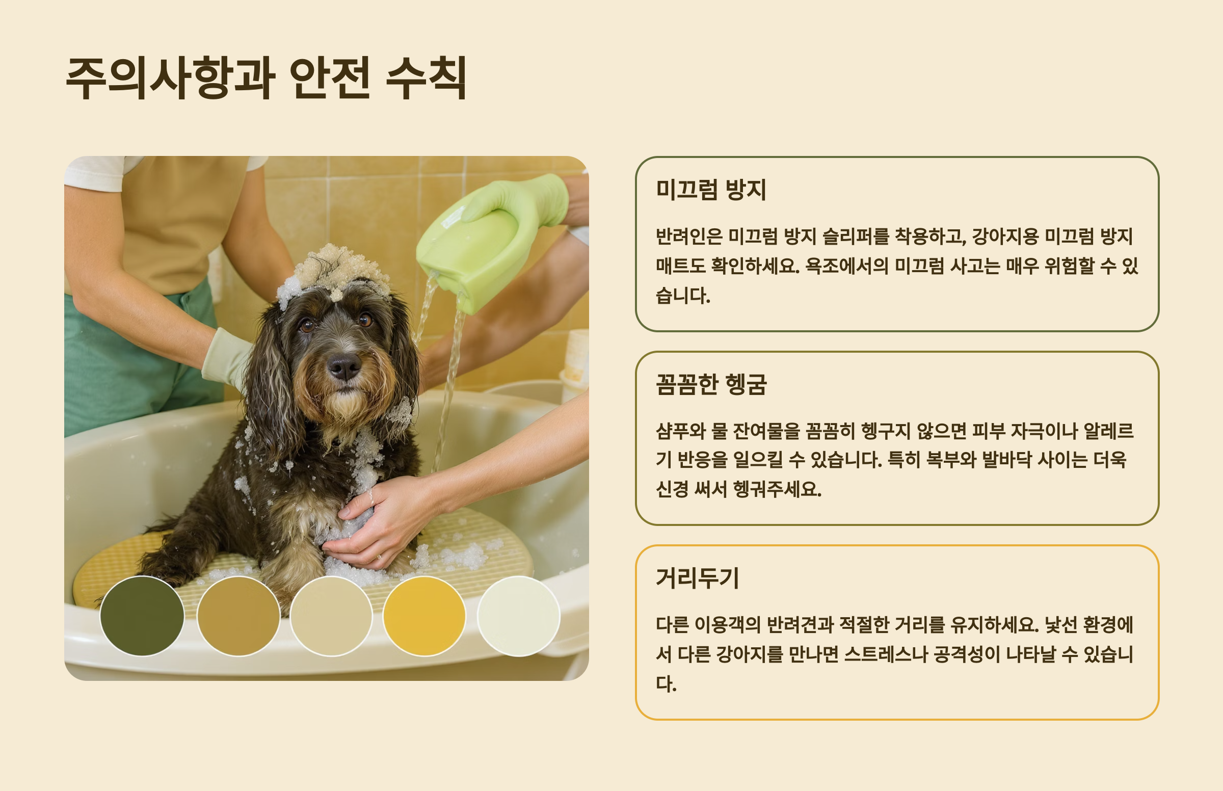 마지막 꿀팁은 '2인 1조 작전'이에요! 혼자서는 힘들 때 가족이나 친구와 함께 가면 훨씬 수월해요. 한 명은 강아지를 잡아주고, 한 명은 씻기는 역할 분담을 하면 시간도 단축되고 스트레스도 줄어든답니다 👥