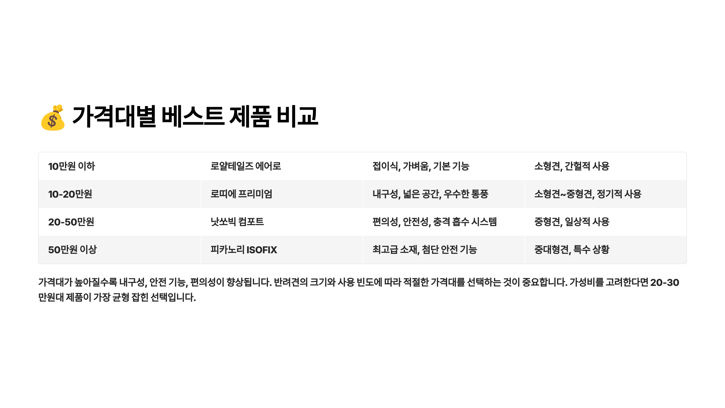 강아지 유모차는 가격대가 정말 다양해요. 5만원부터 50만원까지 천차만별인데, 각 가격대별로 베스트 제품들을 정리해봤어요. 먼저 10만원 이하 제품들은 기본기에 충실한 제품들이 많아요. 다파파 분리형(68,800원), 플라잉도기 저상형(80,100원), 피카노리 4륜(99,000원) 등이 대표적이에요. 이 제품들은 가격은 저렴하지만 안전성과 실용성은 충분히 갖추고 있어요.