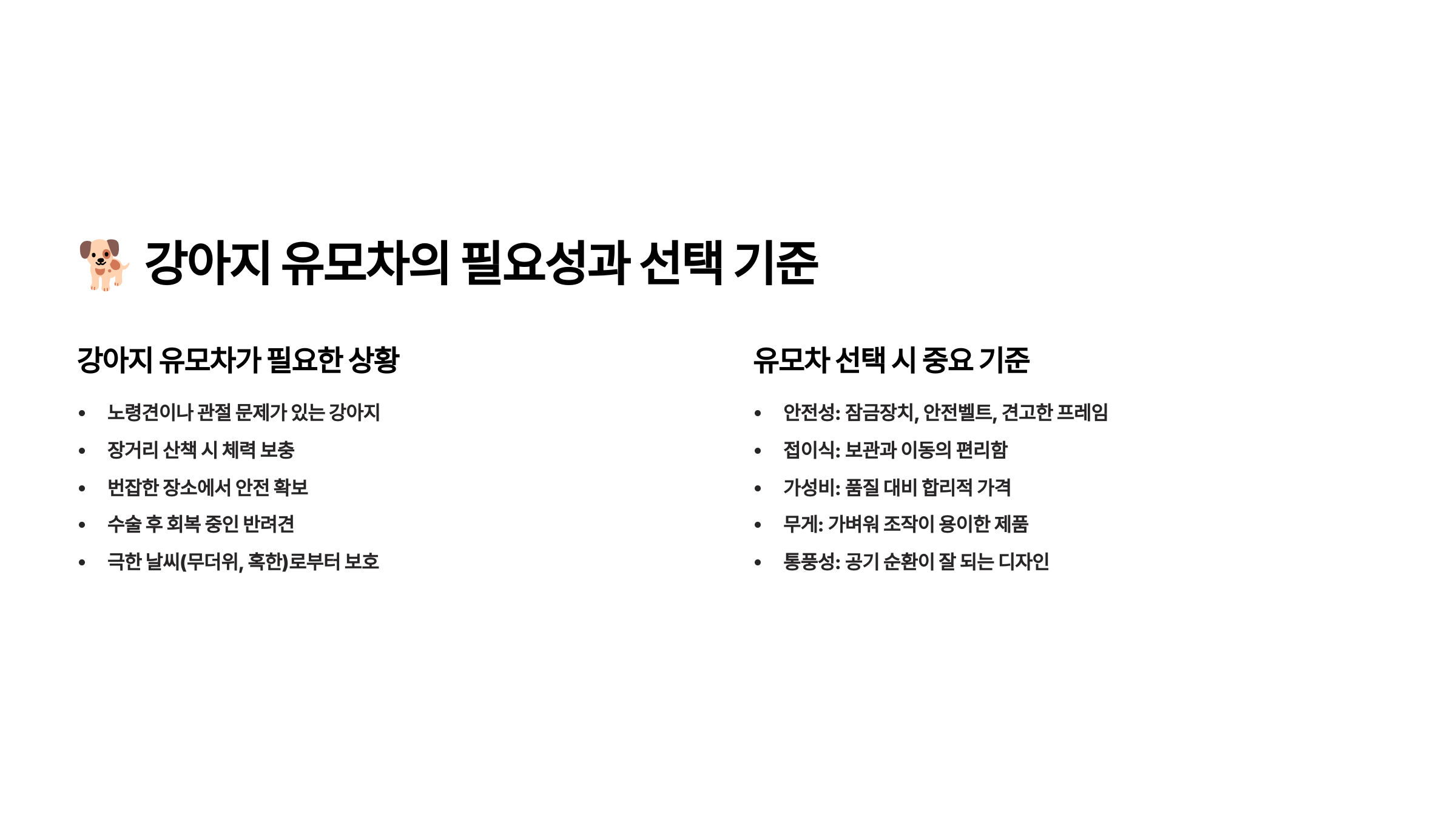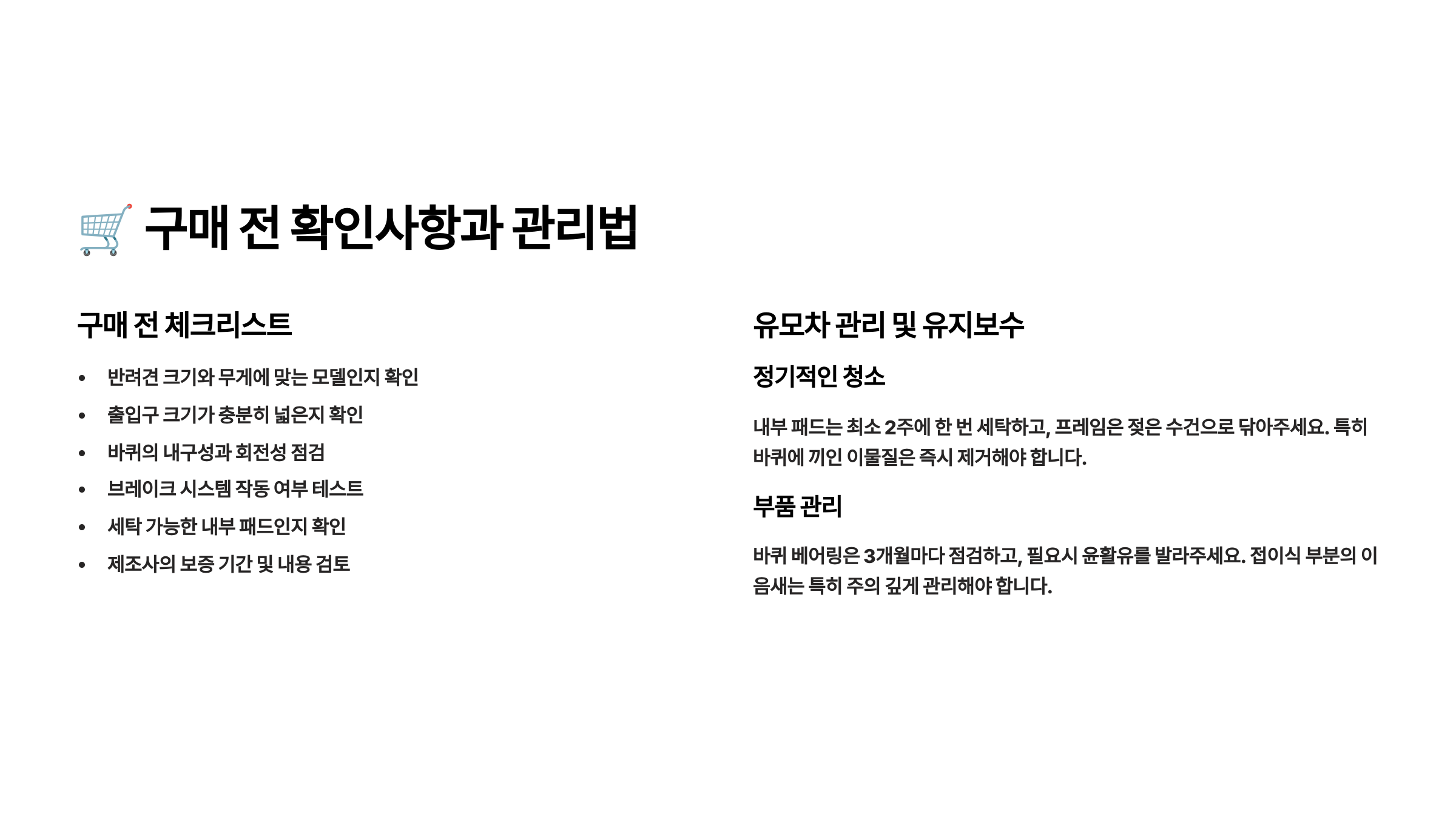 유모차를 선택할 때는 안전성, 편의성, 가격을 종합적으로 고려해야 해요. 무조건 비싼 제품이 좋은 게 아니라, 여러분의 라이프스타일과 강아지의 특성에 맞는 제품을 선택하는 게 중요해요. 오늘 소개해드린 체크리스트와 비교표를 참고하셔서 현명한 선택을 하시길 바라요. 우리 아이와 함께하는 행복한 산책 시간이 되길 응원합니다! 🐾💕