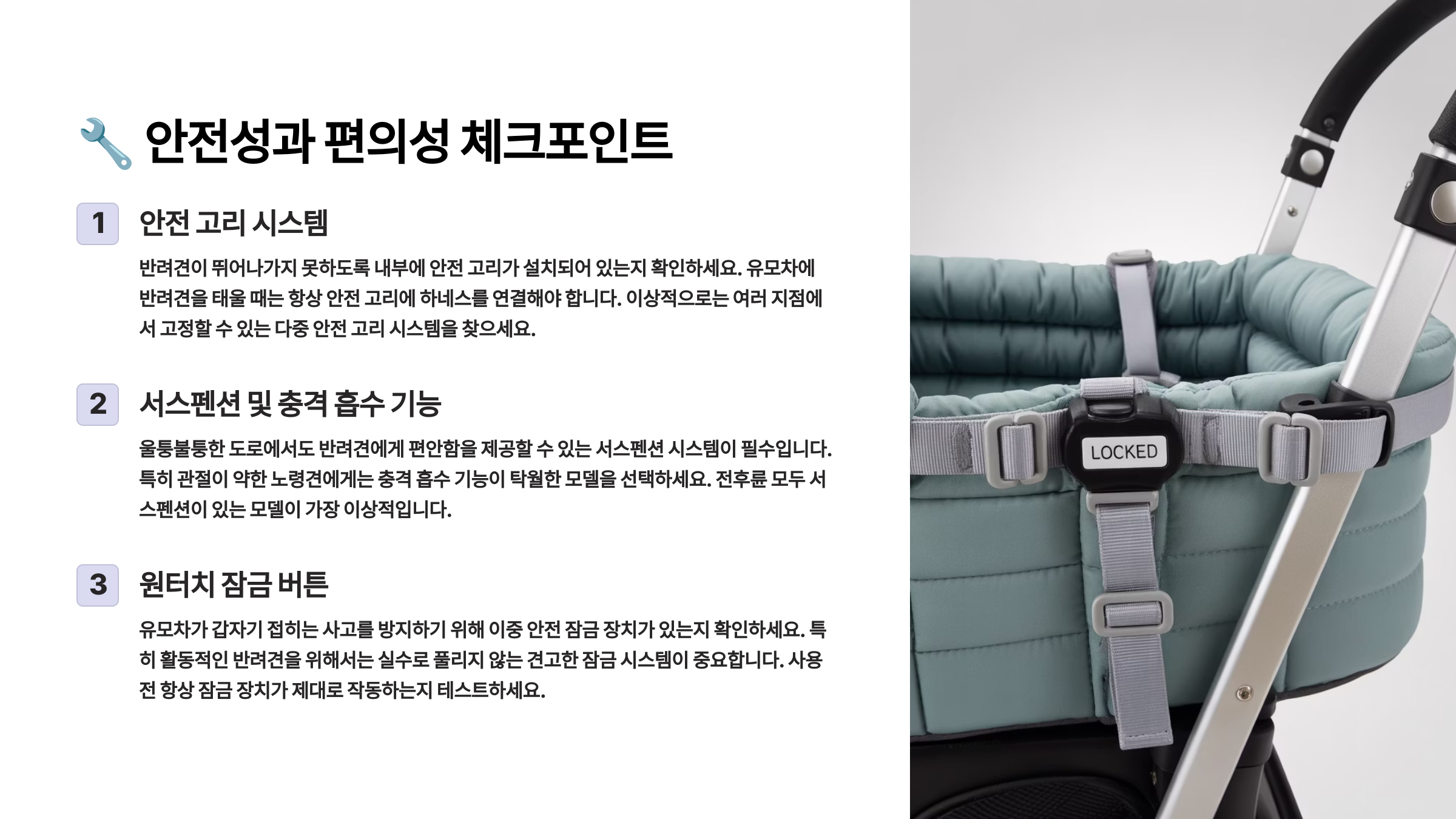 강아지 유모차를 선택할 때 가장 중요한 기준은 안전성이에요. 프레임이 튼튼한지, 바퀴가 안정적인지, 안전벨트나 목줄 고리가 있는지 꼼꼼히 확인해야 해요. 특히 4륜 구조의 유모차가 3륜보다 안정적이고, 앞바퀴가 360도 회전되는 제품이 방향 전환이 쉬워요. 또한 충격 흡수 기능이 있는 바퀴를 선택하면 울퉁불퉁한 길에서도 강아지가 편안하게 탈 수 있답니다.