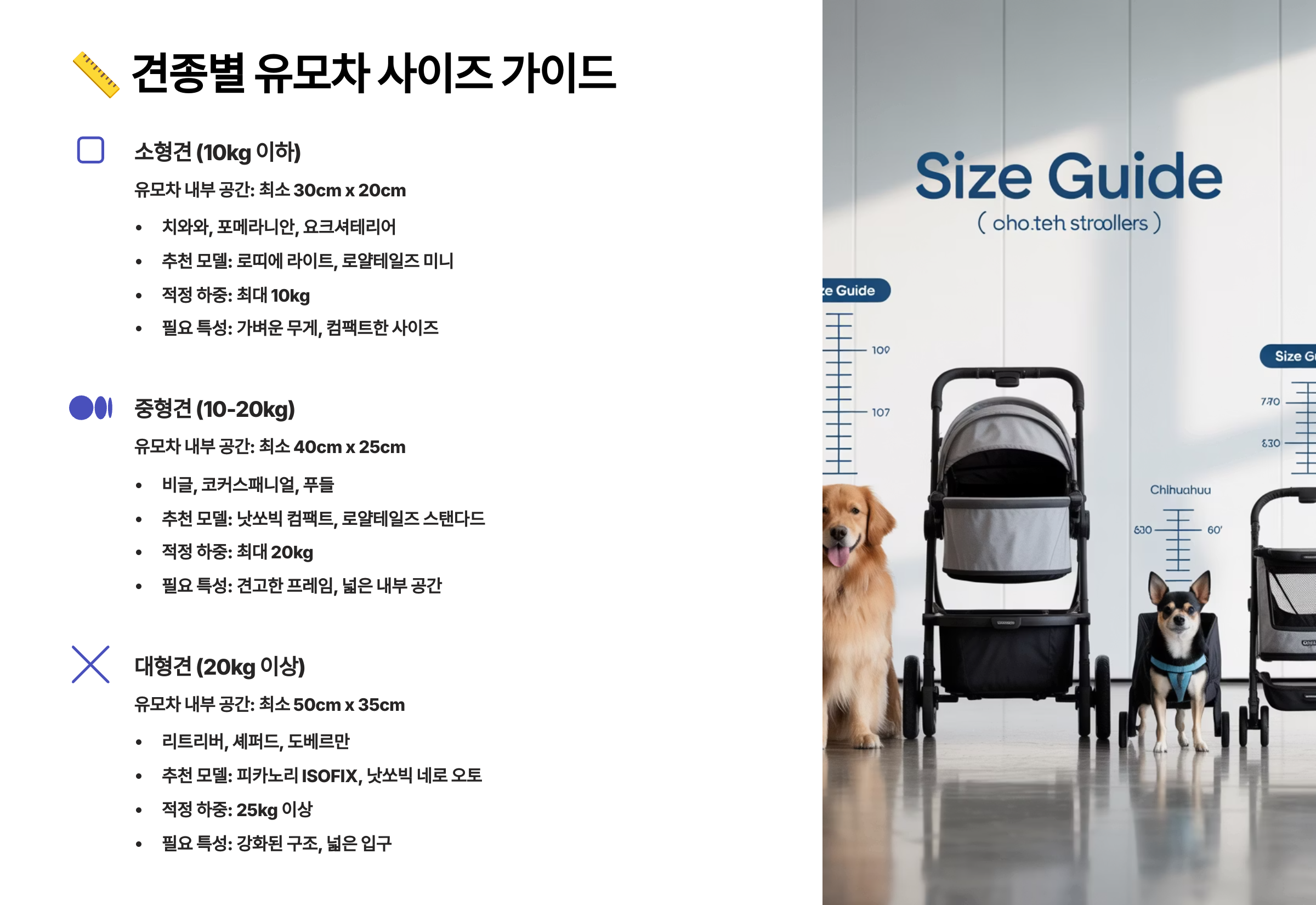 말티즈, 포메라니안, 치와와 같은 초소형견은 대부분의 유모차에 잘 맞아요. 하지만 푸들, 비숑, 시츄 같은 소형견은 조금 더 넉넉한 공간이 필요해요. 특히 털이 풍성한 견종은 실제 체중보다 더 많은 공간이 필요하답니다. 코카스파니엘, 비글 같은 중형견은 최소 가로 50cm, 세로 40cm 이상의 공간이 필요해요.