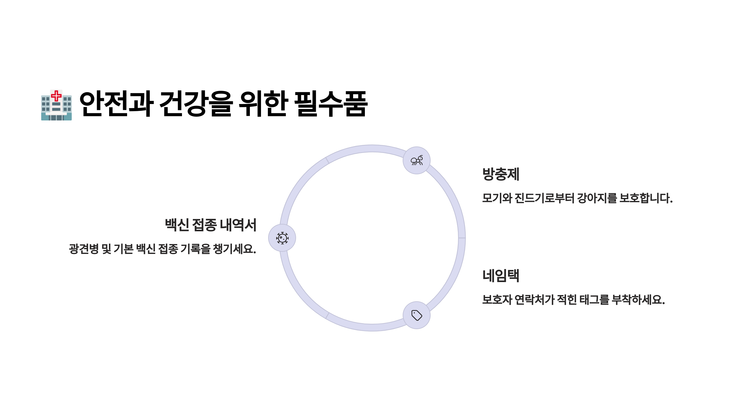 | 안전용품 | 목줄, 하네스, 인식표 | 필수 |