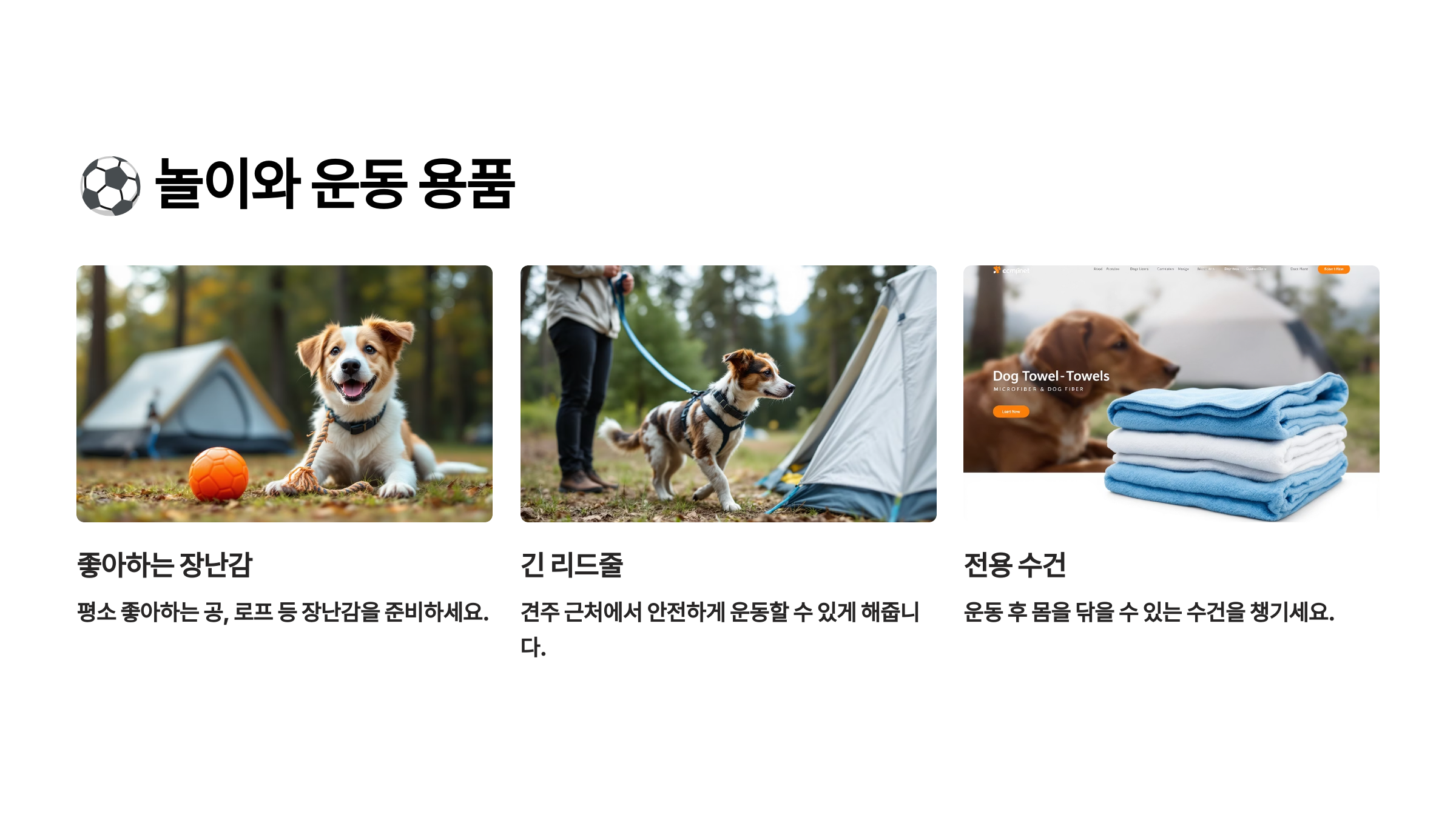 | 안전용품 | 목줄, 하네스, 인식표 | 필수 |
