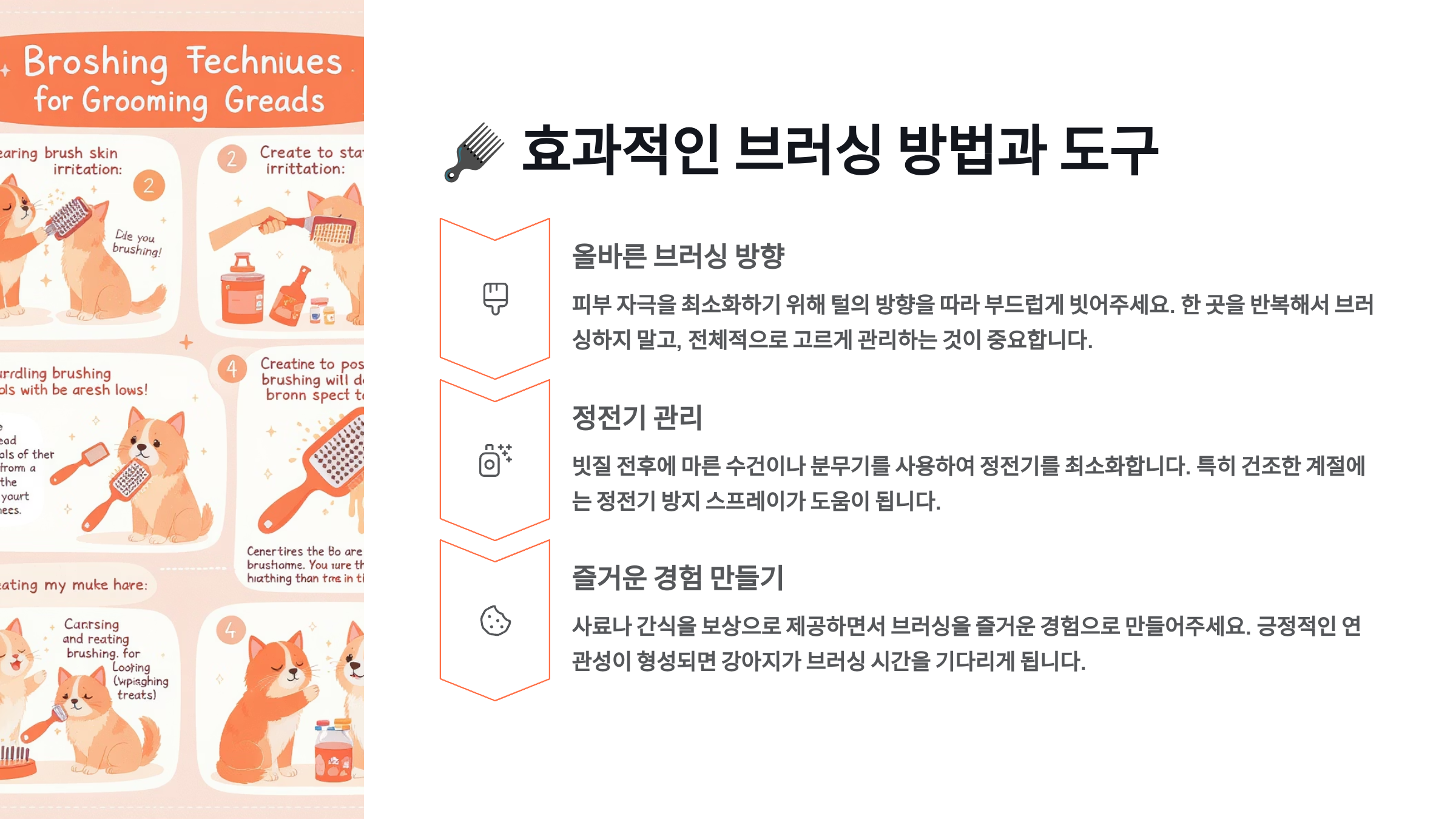 브러싱 도구는 털 타입에 따라 달라져요. 슬리커 브러시는 가장 기본적인 도구로, 엉킨 털을 풀고 죽은 털을 제거하는 데 효과적이에요. 핀 브러시는 긴 털을 가진 견종에게 적합하고, 브리슬 브러시는 짧은 털 견종에게 좋아요. 언더코트 레이크는 이중모 견종의 속털을 제거하는 데 탁월하답니다. 도구를 잘못 선택하면 피부에 상처를 줄 수 있으니 신중하게 고르세요!