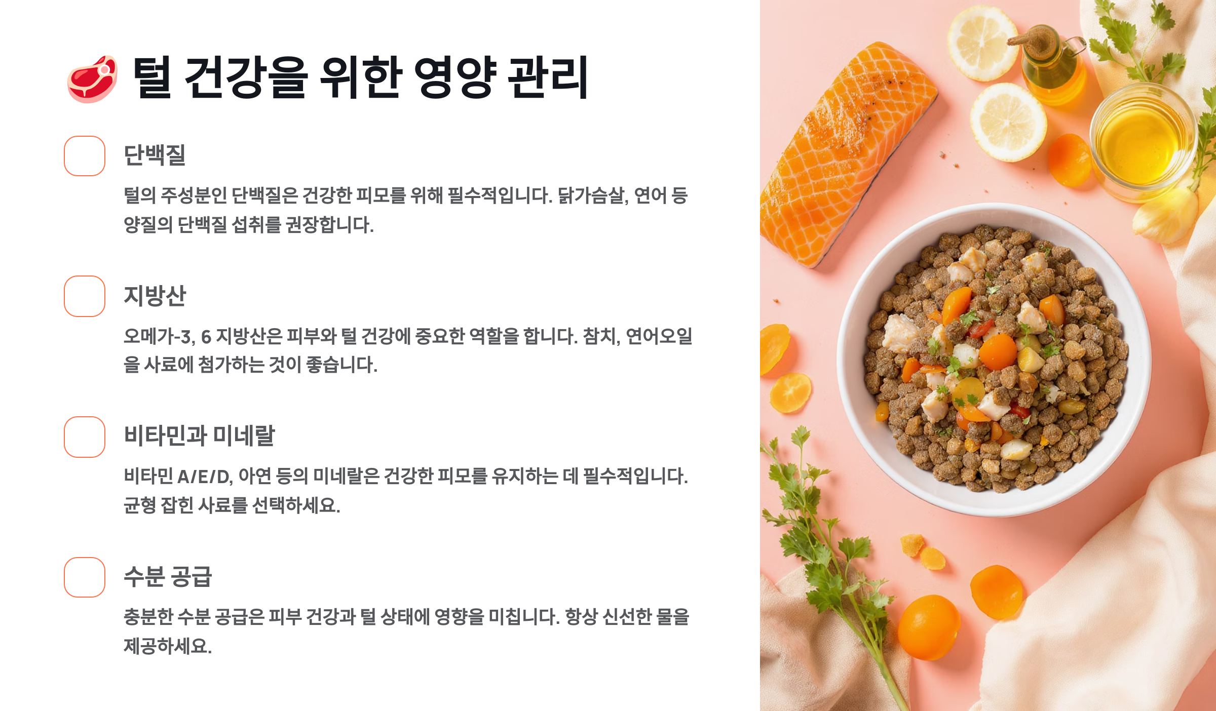 영양 결핍도 털 건강에 큰 영향을 미쳐요. 저품질 사료를 먹거나 편식이 심하면 필수 영양소가 부족해질 수 있어요. 특히 단백질, 비타민 A, E, 아연, 오메가 지방산이 부족하면 털이 푸석해지고 많이 빠져요. 사료를 바꾸거나 영양제를 추가하면 개선될 수 있지만, 급격한 변화는 피하고 서서히 바꿔주세요. 🥗