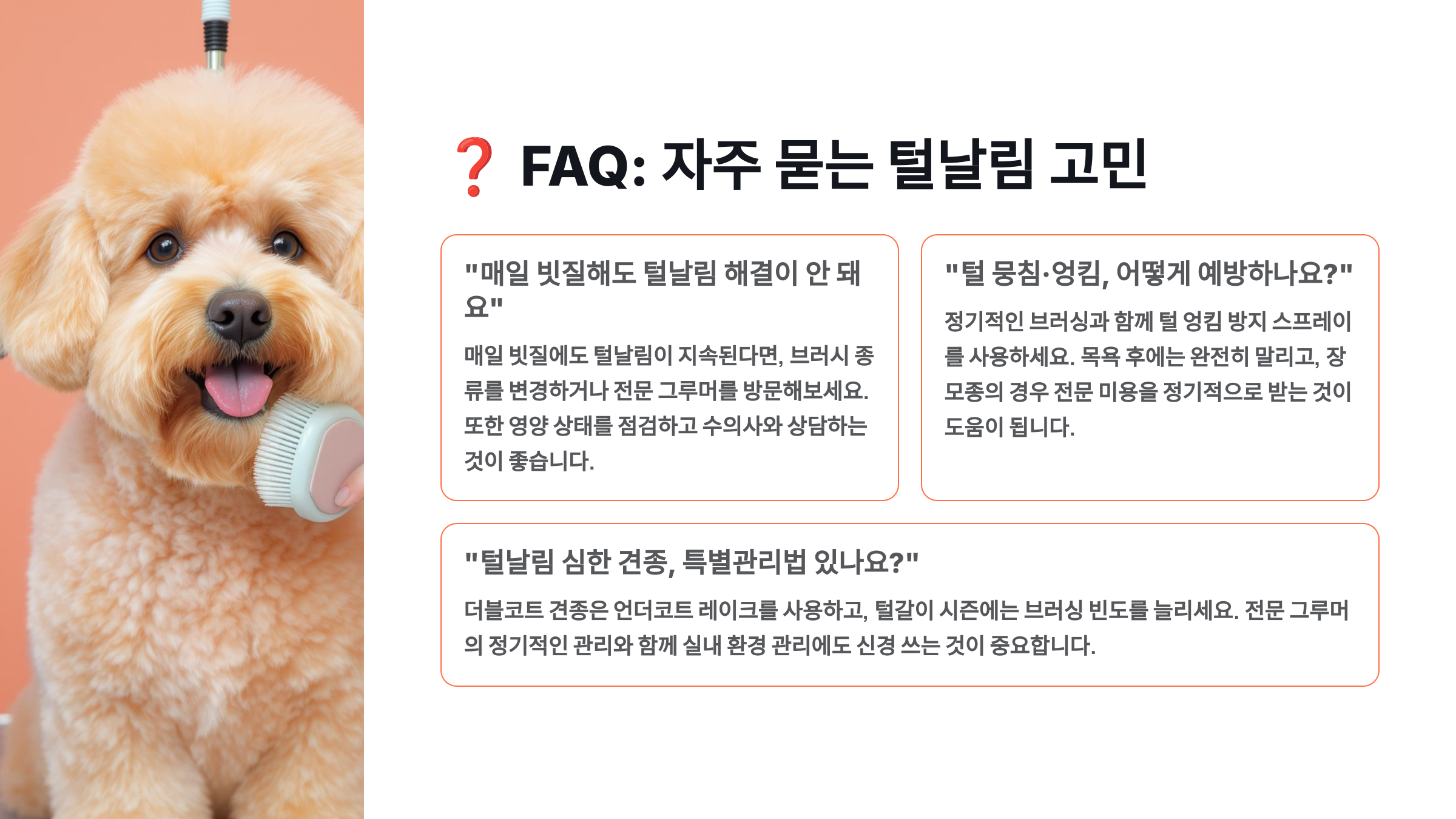 전문 미용실의 도움을 받는 것도 좋은 방법이에요. 특히 털이 심하게 엉킨 경우나 전문적인 트리밍이 필요한 경우는 전문가에게 맡기는 게 안전해요. 정기적인 미용(4-8주마다)은 털날림 관리에 큰 도움이 된답니다. 미용사에게 집에서의 관리 팁을 물어보면 유용한 조언을 얻을 수 있어요. ✂️