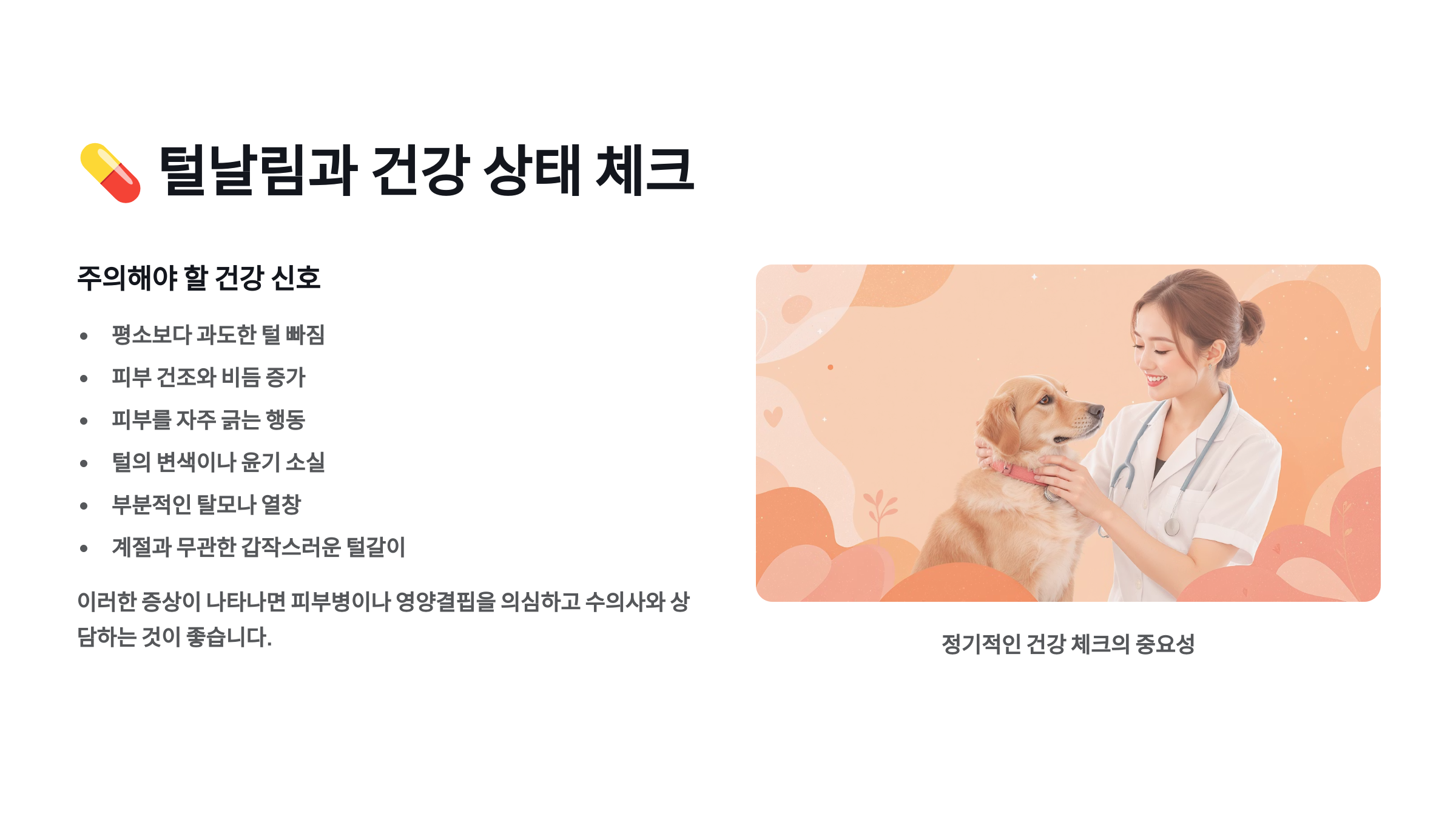 비정상적인 탈모의 징후를 알아두세요. 특정 부위만 집중적으로 빠지거나, 원형 탈모가 생기거나, 피부가 보일 정도로 털이 빠진다면 문제가 있어요. 가려움증이 심해서 계속 긁거나, 피부가 붉어지고 각질이 일어나는 것도 주의 신호예요. 털이 푸석푸석하고 윤기가 없어지는 것도 건강 이상의 신호일 수 있답니다. 🚨