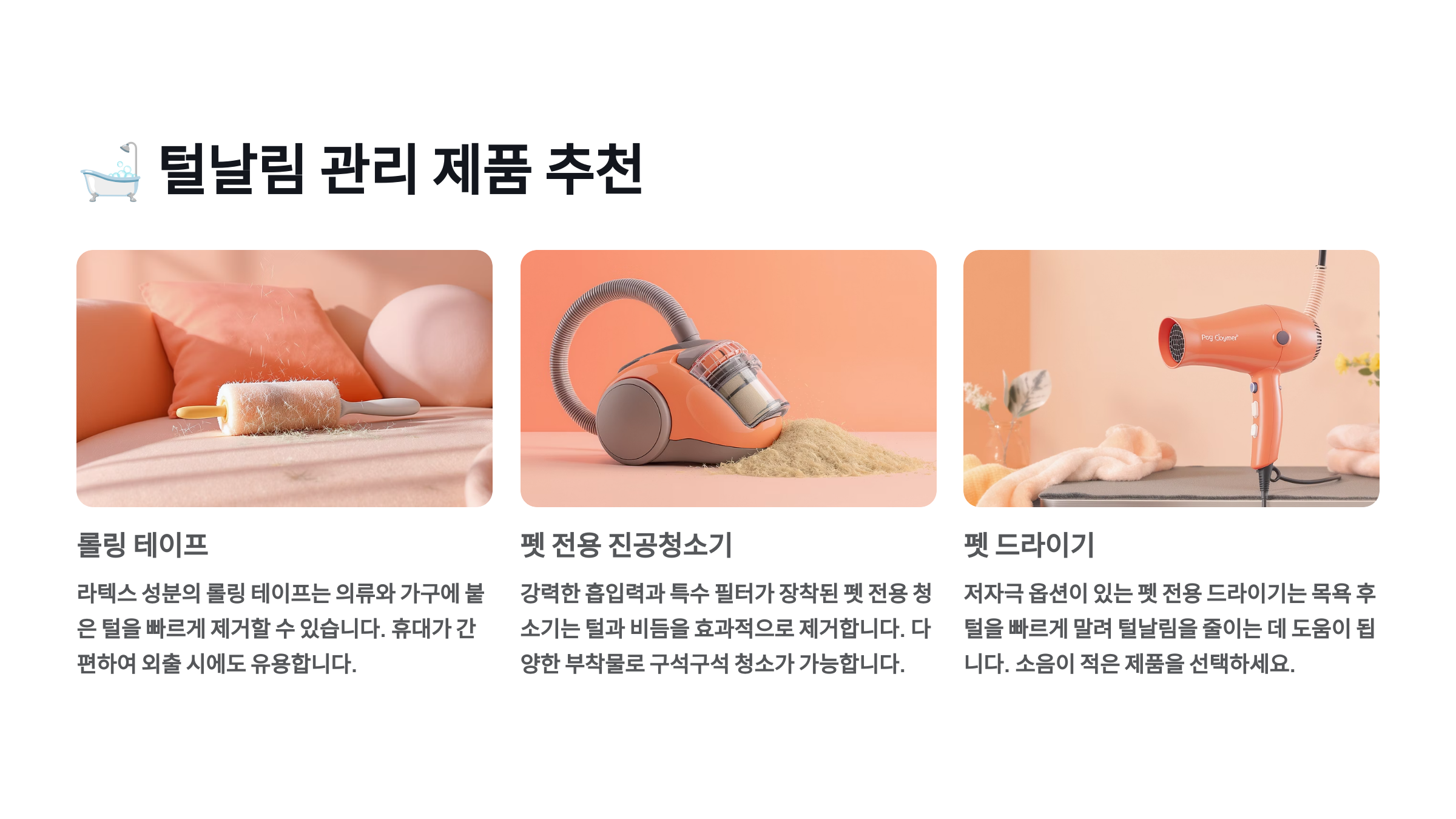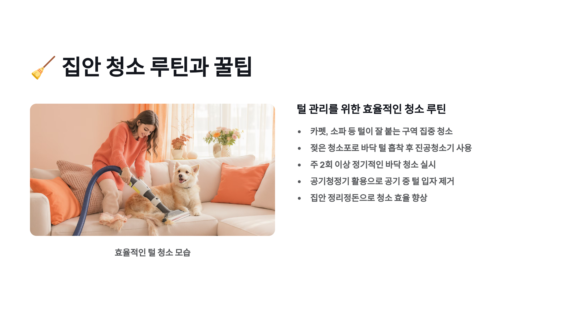청소 도구 선택이 반은 먹고 들어가요. 일반 청소기보다는 펫 전용 청소기가 훨씬 효과적이에요. 강력한 흡입력과 특수 브러시로 카펫이나 소파에 박힌 털까지 제거할 수 있죠. 무선 청소기는 수시로 사용하기 편해서 인기가 많아요. 로봇 청소기도 좋은 선택인데, 매일 자동으로 청소해주니 털이 쌓일 틈이 없답니다. 🤖