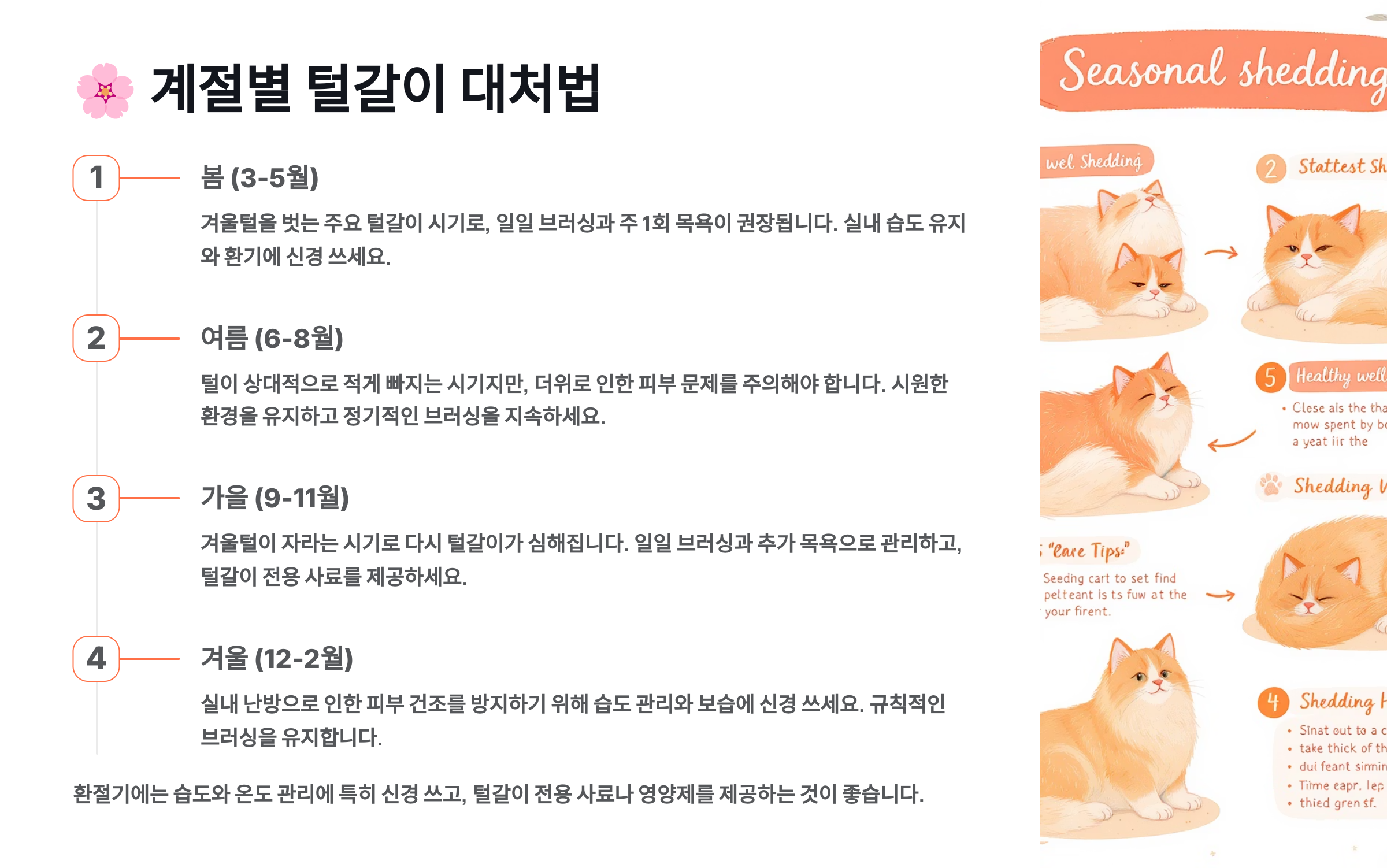 봄 (3-5월) 매우 많음 매일 브러싱, 자주 목욕