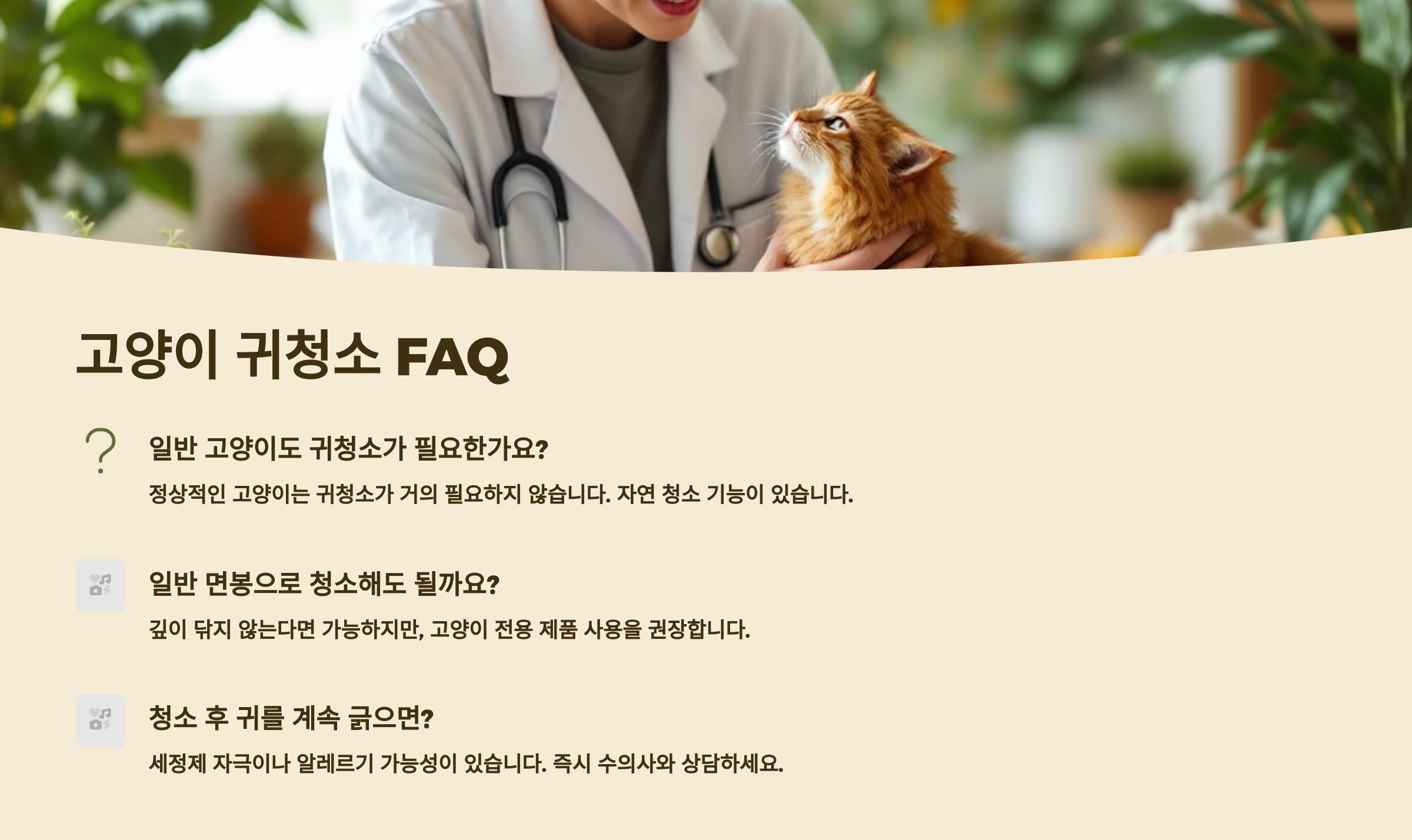 | 청소용액 | 고양이 전용 귀청소제 | 필수 | 사람용 제품 금지 |