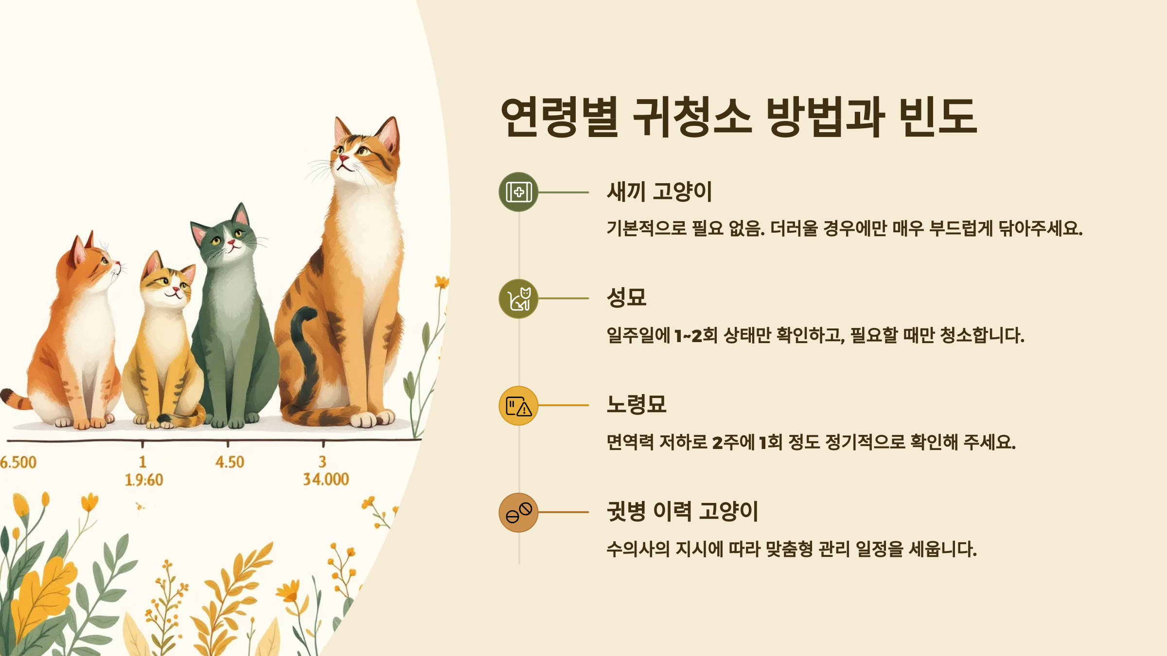 고양이의 연령대별로 귀청소 방법과 빈도를 조절하는 것이 중요해요. 새끼 고양이(0-6개월)의 경우 귀가 매우 작고 연약해서 특별한 주의가 필요해요. 이 시기의 새끼 고양이들은 면역체계가 완전히 발달하지 않아서 감염에 취약하지만, 동시에 과도한 청소는 오히려 해로울 수 있어요. 일반적으로 2주에 한 번 정도로 충분하고, 매우 부드러운 거즈나 젖은 면봉으로 귓바퀴 바깥쪽만 살짝 닦아주는 수준으로 해야 해요. 새끼 고양이용 순한 귀청소제를 사용하되, 양을 최소한으로 하고 깊이 들어가지 않도록 주의해야 해요. 또한 새끼 고양이는 체온 조절 능력이 부족하니 청소 후 따뜻하게 해주는 것도 중요하답니다.