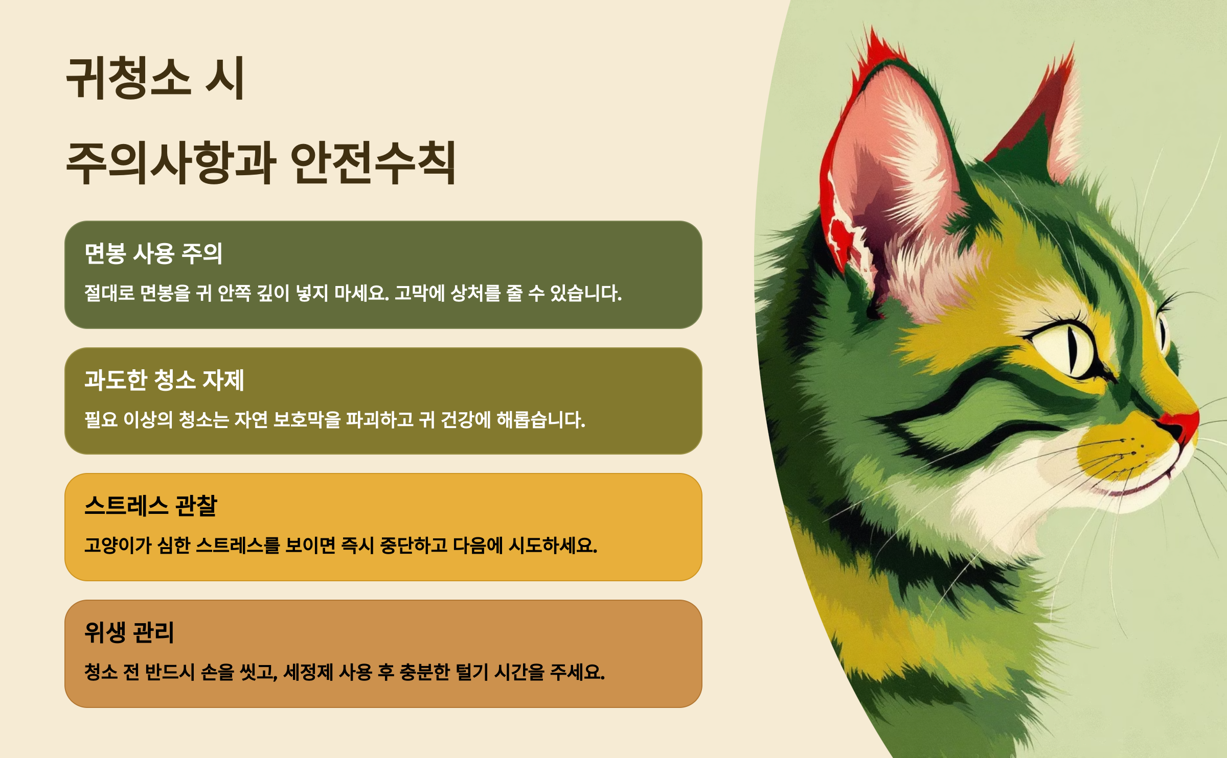 고양이 귀청소에서 가장 중요한 안전수칙은 '절대 깊이 들어가지 않기'예요. 고양이의 귀는 L자 형태로 되어 있어서 우리가 보는 부분은 외이도의 입구 부분일 뿐이에요. 면봉이나 다른 도구를 귀 안쪽 깊숙이 넣으면 고막을 손상시키거나 귀지를 더 안쪽으로 밀어넣을 수 있어서 매우 위험해요. 보이는 범위 내에서만 청소하고, 1cm 이상 깊이 들어가지 않도록 주의해야 해요. 특히 고양이가 갑자기 움직일 때 도구가 깊이 들어갈 수 있으니 항상 안전거리를 유지하는 것이 중요하답니다. 만약 실수로 도구를 떨어뜨렸거나 고양이가 심하게 움직였다면 즉시 수의사에게 연락해서 상담받아야 해요.