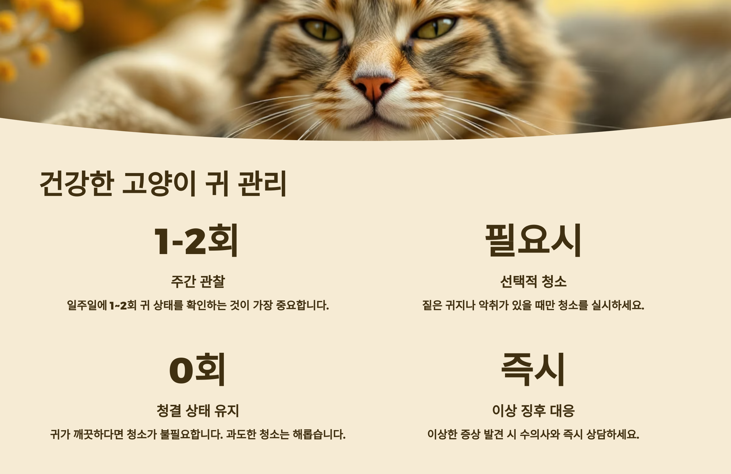 귀청소의 빈도도 개체별로 차이가 있어요. 일반적으로 건강한 성묘는 2-3주에 한 번 정도가 적당하고, 귀 문제가 있는 고양이는 수의사 지시에 따라 더 자주 해야 할 수도 있어요. 중요한 것은 고양이가 스트레스받지 않는 선에서 꾸준히 하는 거예요! 🐱