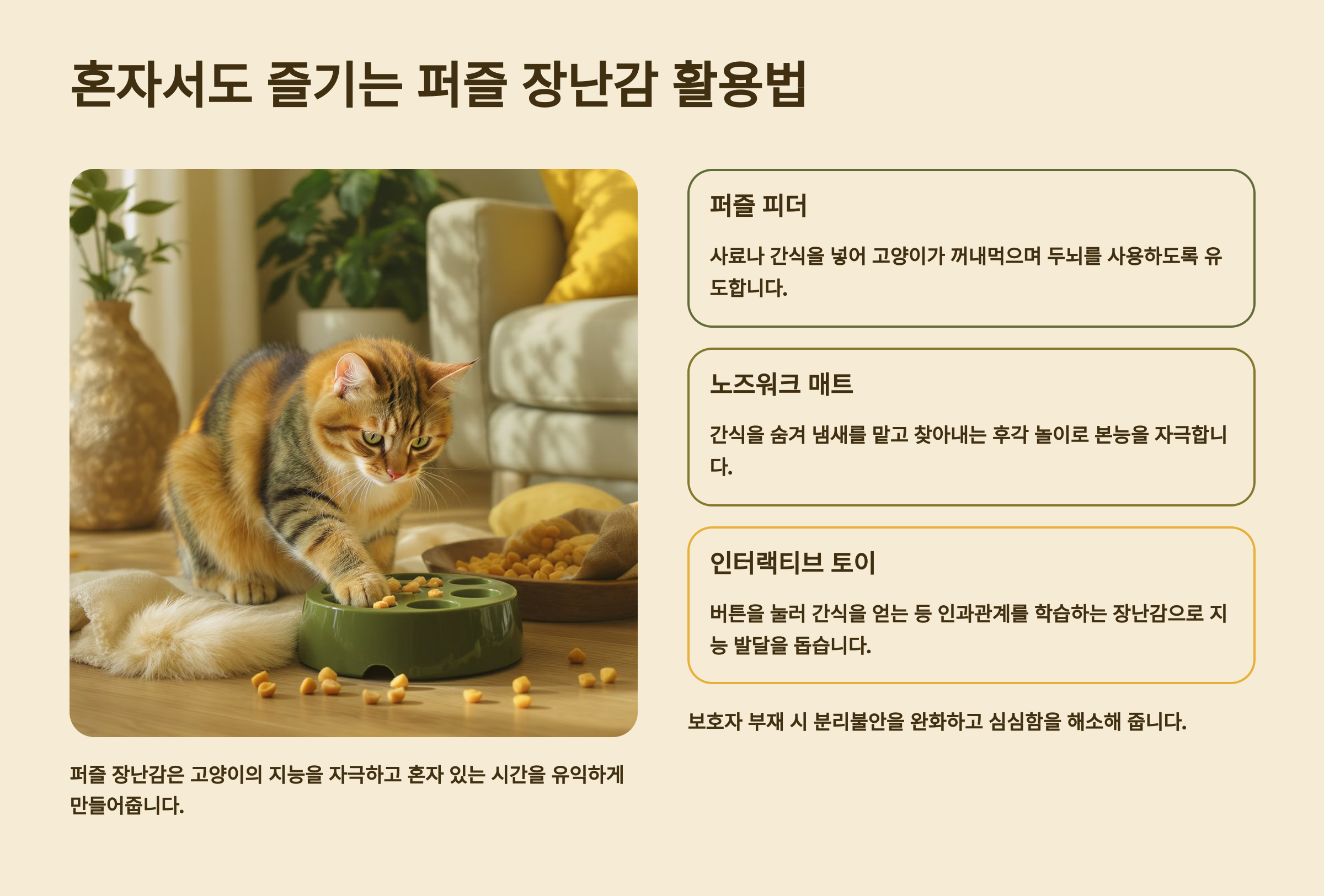 집사가 바쁠 때도 고양이가 심심하지 않게 해주고 싶으신가요? 퍼즐 장난감은 고양이가 혼자서도 즐겁게 놀 수 있는 최고의 아이템이에요! 특히 먹이 퍼즐은 놀이와 식사를 동시에 해결할 수 있어서 일석이조랍니다. 고양이의 두뇌를 자극하면서도 재미있게 시간을 보낼 수 있는 퍼즐 장난감 활용법을 알아볼까요?