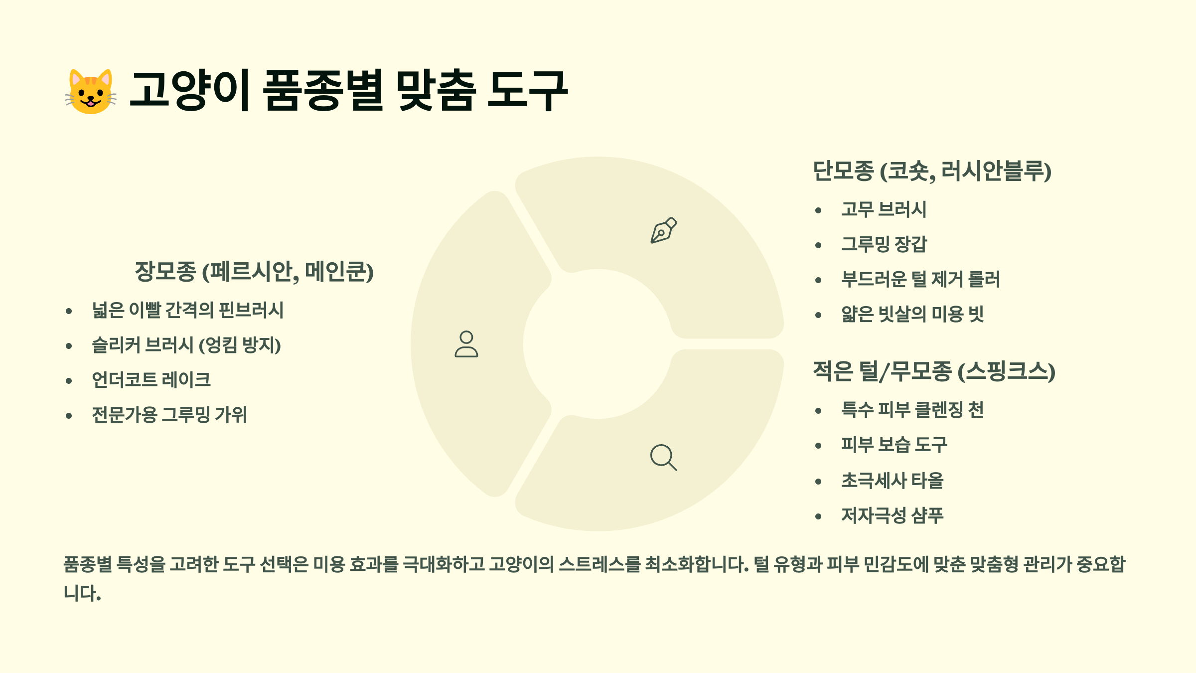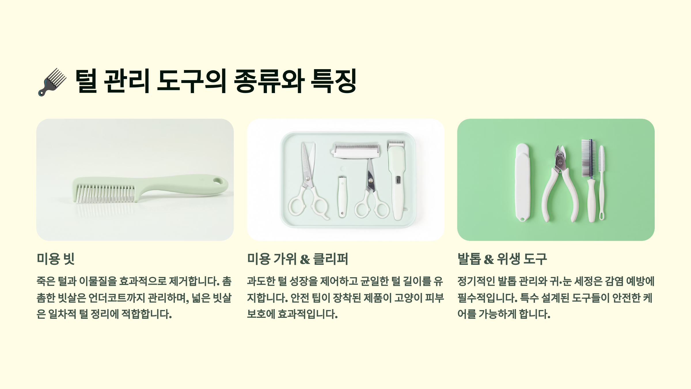 이 가이드에서는 다양한 고양이 미용도구의 기능과 특징을 상세히 비교하고, 각 도구의 올바른 사용법과 선택 기준을 제시해요. 초보 집사부터 경험 많은 집사까지 모두에게 도움이 될 실용적인 정보를 담았답니다. 함께 우리 고양이에게 맞는 최적의 미용도구를 찾아보아요! 🐾