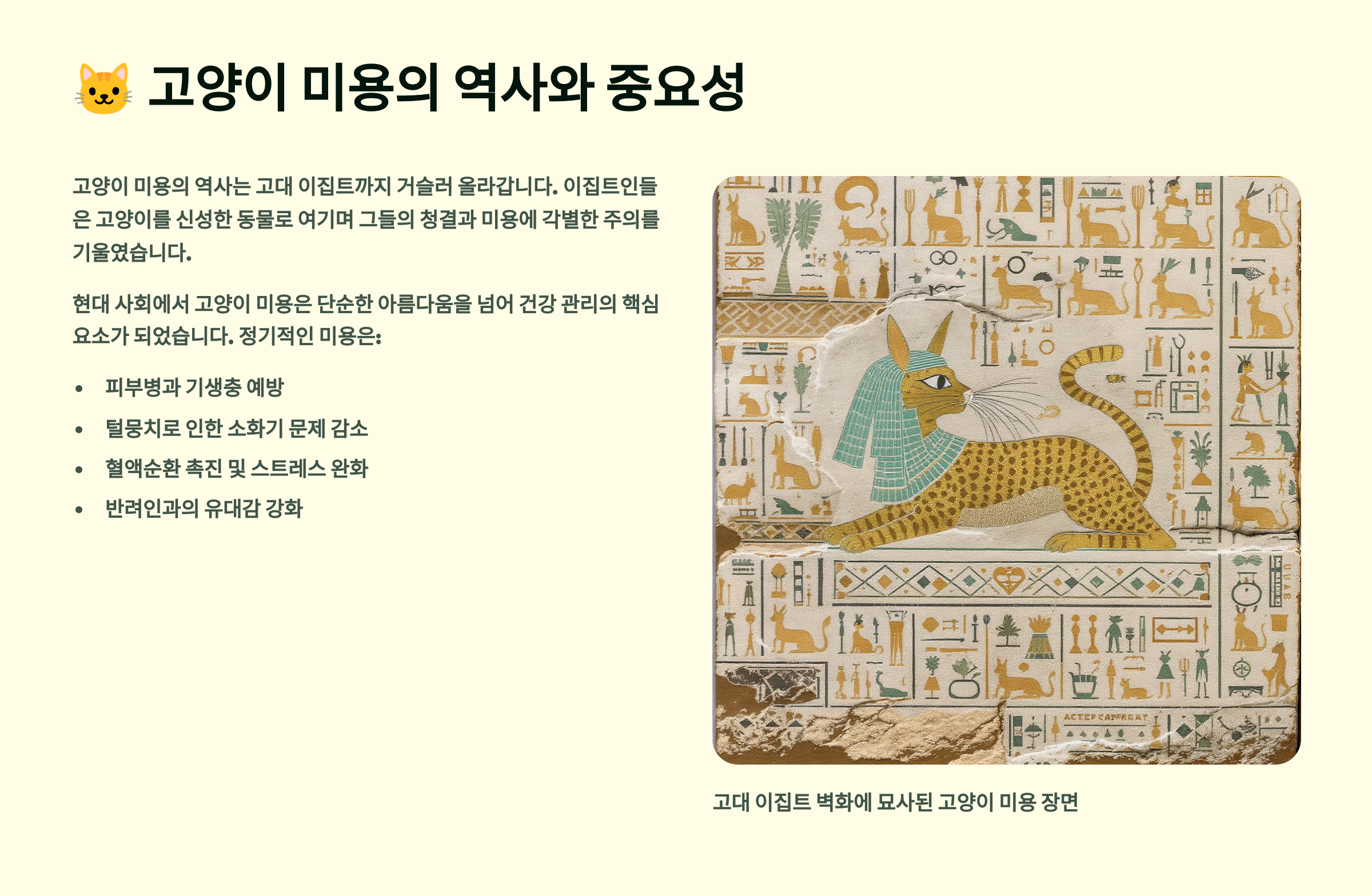 고양이 미용의 역사는 고대 이집트 시대로 거슬러 올라가요. 이집트인들은 고양이를 신성한 동물로 여겼고, 왕실 고양이들을 위한 특별한 미용 도구들을 만들었답니다. 황금으로 만든 빗과 상아로 만든 발톱 다듬기 도구들이 파라오의 무덤에서 발견되기도 했어요. 당시에는 고양이의 털을 빗질하는 것이 종교적 의식의 일부였다고 해요.