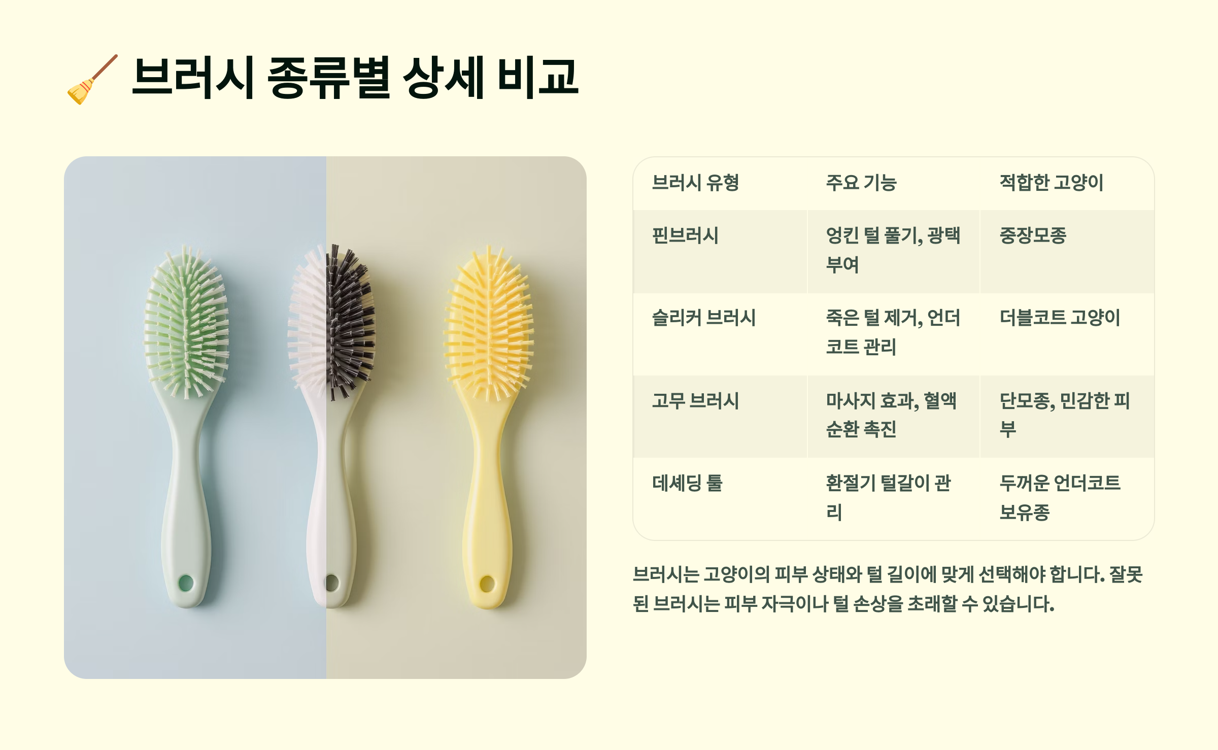 고양이 브러시는 정말 다양한 종류가 있어요. 각 브러시마다 특징과 용도가 달라서 고양이의 털 타입, 길이, 밀도에 따라 적절한 브러시를 선택해야 한답니다. 브러시 선택을 잘못하면 오히려 고양이에게 스트레스를 주거나 피부를 상하게 할 수 있으니 신중하게 골라야 해요.