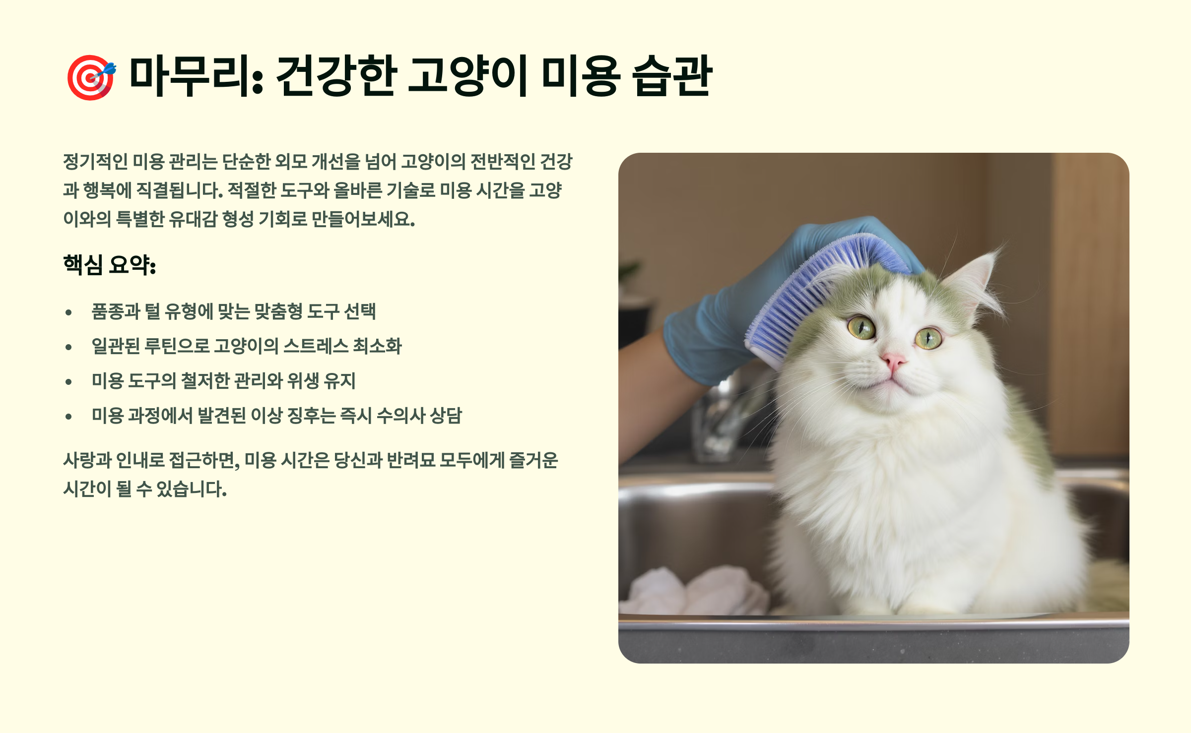 이 가이드가 여러분의 고양이 미용 여정에 도움이 되길 바라요. 사랑하는 고양이와 함께하는 미용 시간이 즐겁고 행복한 추억이 되기를 응원합니다. 건강하고 아름다운 고양이와 함께하는 일상이 더욱 풍요로워지길 바라며, 앞으로도 꾸준한 관리로 고양이의 건강과 행복을 지켜주세요! 🐱💕
