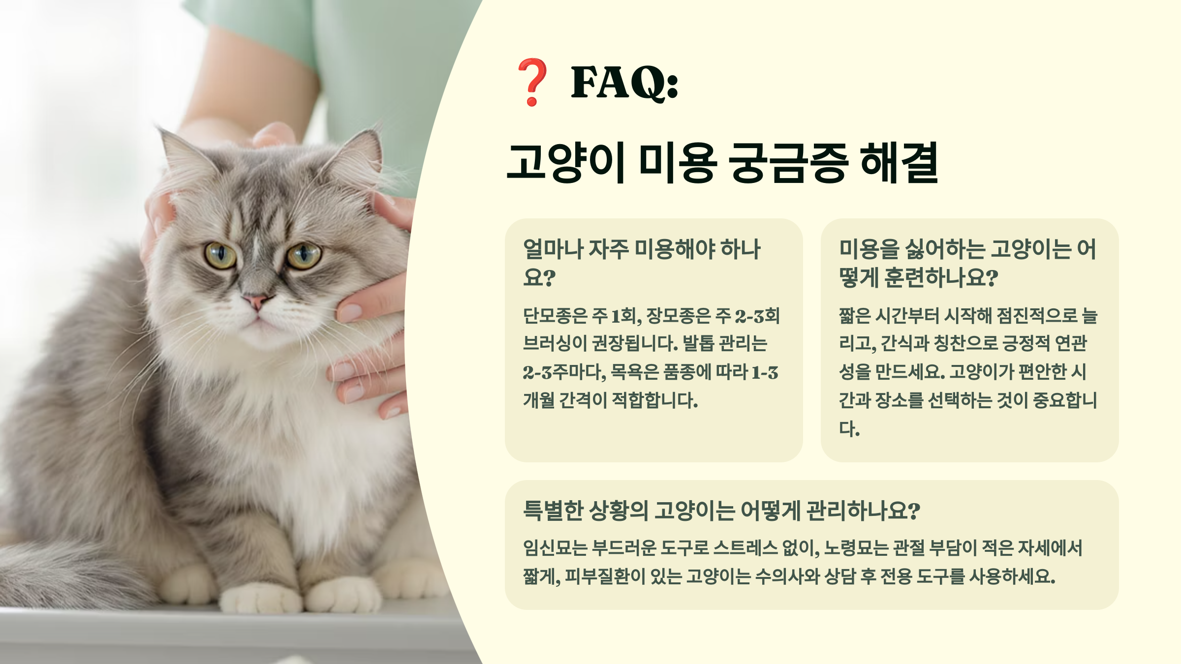 A6. 기본적인 브러싱과 발톱 관리는 집에서 충분히 가능해요. 하지만 심한 매트 제거, 전체 미용, 특수한 컷은 전문가에게 맡기는 것이 안전해요. 장모종은 여름에 한 번 정도 전문 미용을 받으면 관리가 수월해져요. 고양이가 스트레스를 많이 받는다면 출장 미용 서비스도 고려해보세요.