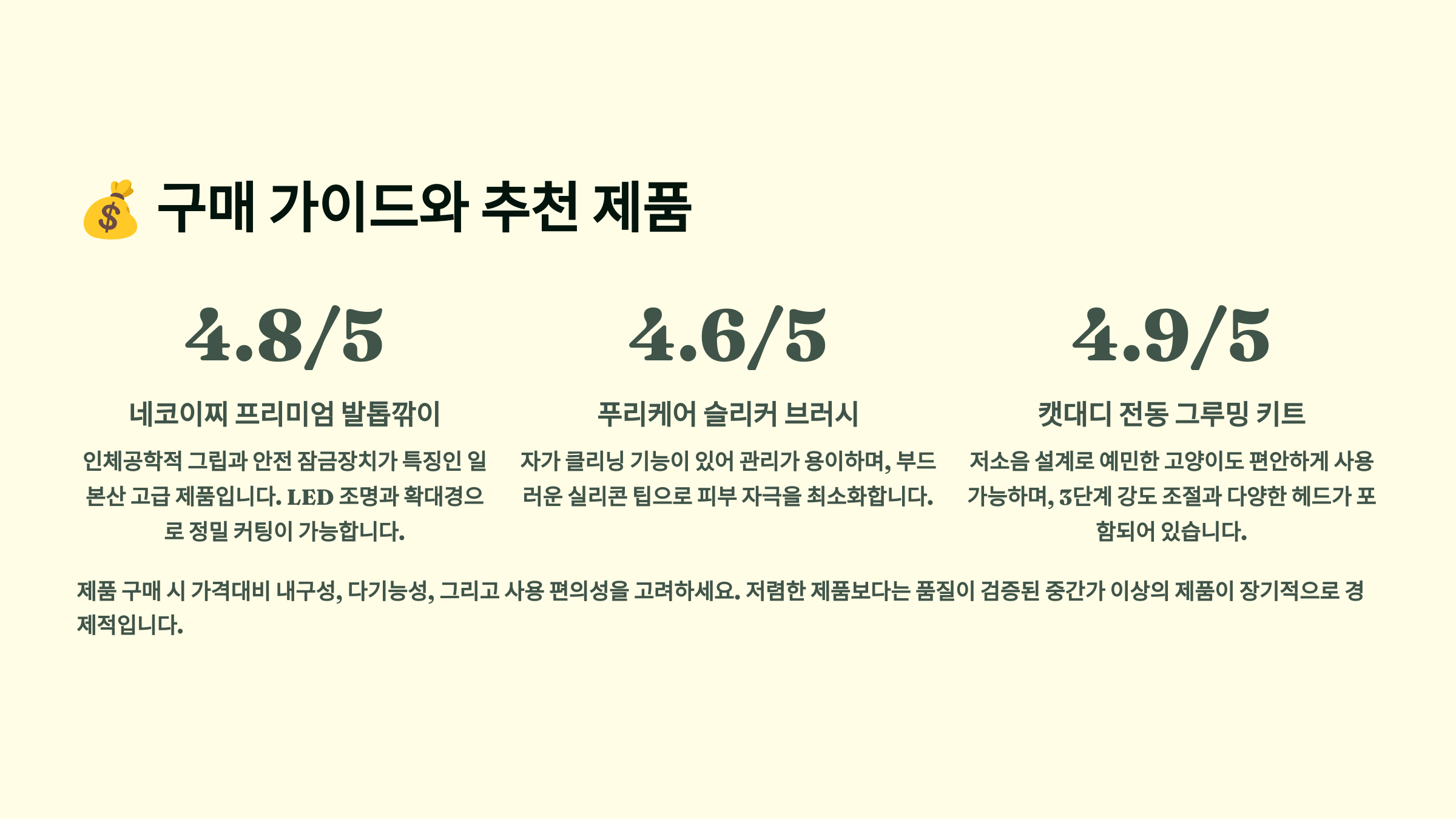 | 그라인더 | 안전, 매끄러운 마감 | 소음, 시간 소요 | 예민한 고양이, 정교한 작업 |