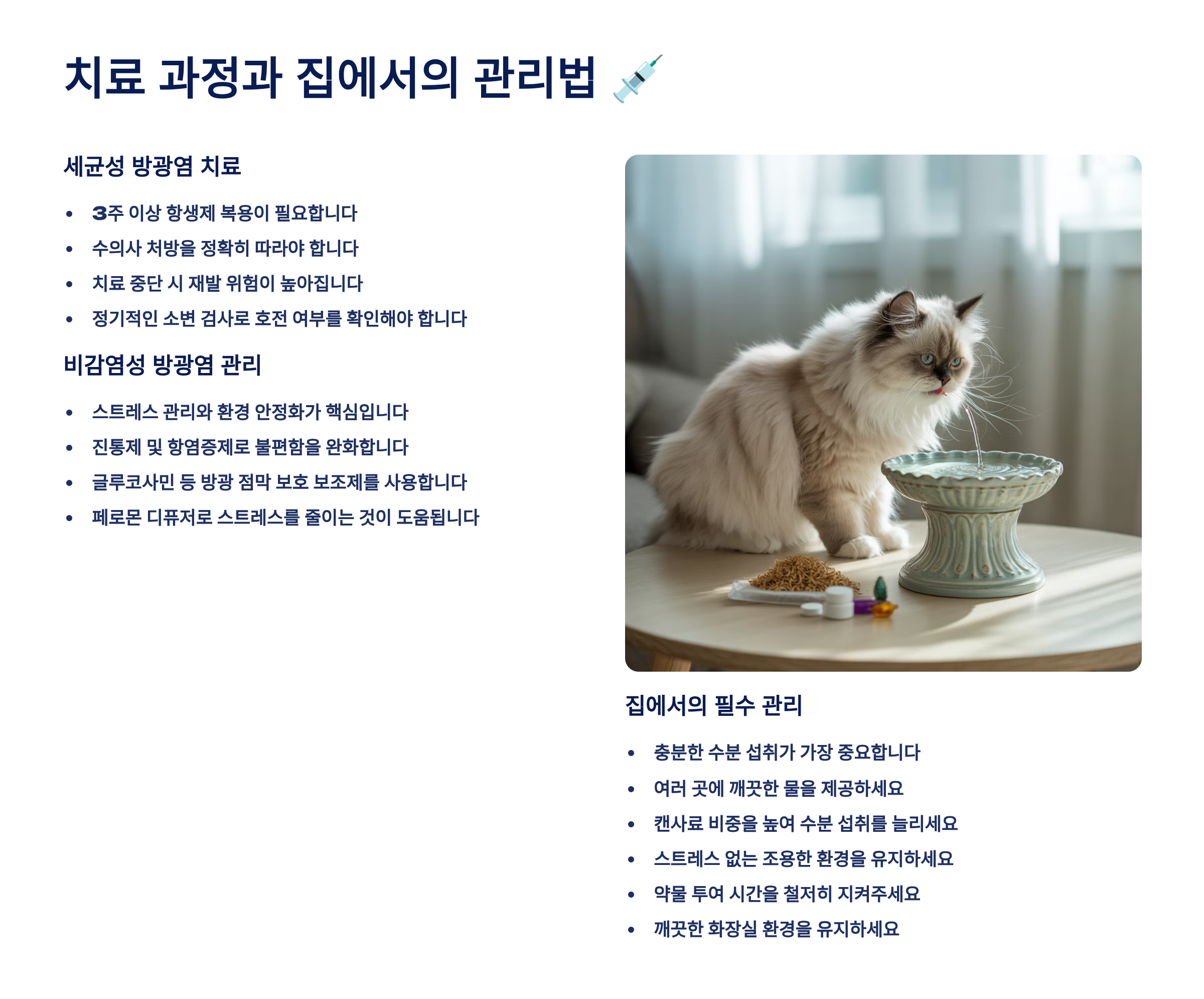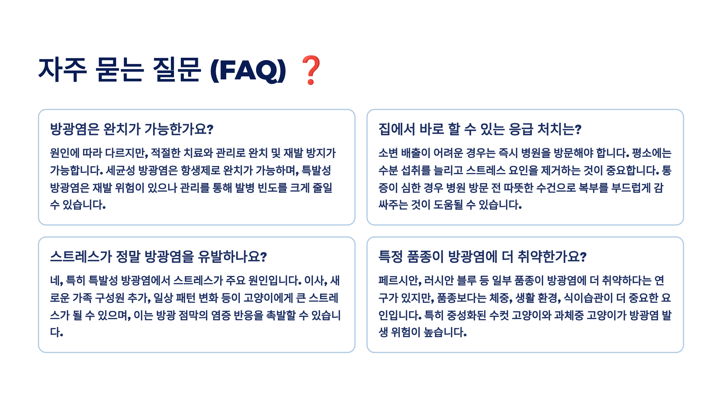 나의 생각으로는 고양이 방광염은 단순한 비뇨기 질환이 아니라 고양이의 전반적인 삶의 질과 직결되는 문제예요. 배뇨 시 통증은 고양이에게 극심한 스트레스를 주고, 이는 다시 방광염을 악화시키는 악순환을 만들 수 있습니다. 따라서 증상 관리뿐만 아니라 근본적인 원인 해결이 중요해요.