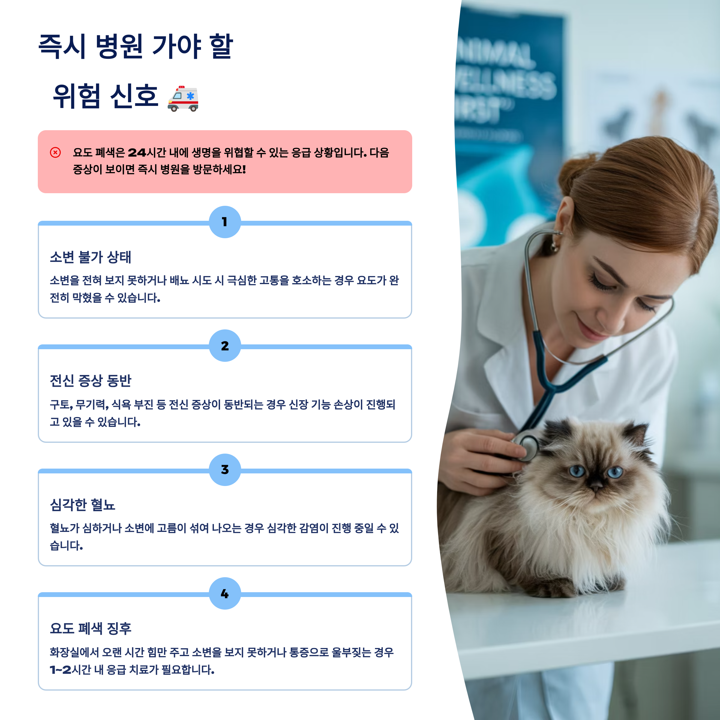 고양이 방광염은 때로 생명을 위협하는 응급 상황으로 발전할 수 있어요. 특히 수컷 고양이의 경우 요도 폐색이 발생하면 24-48시간 내에 치명적인 상황이 될 수 있습니다. 다음과 같은 증상이 나타나면 즉시 동물병원으로 가야 해요.