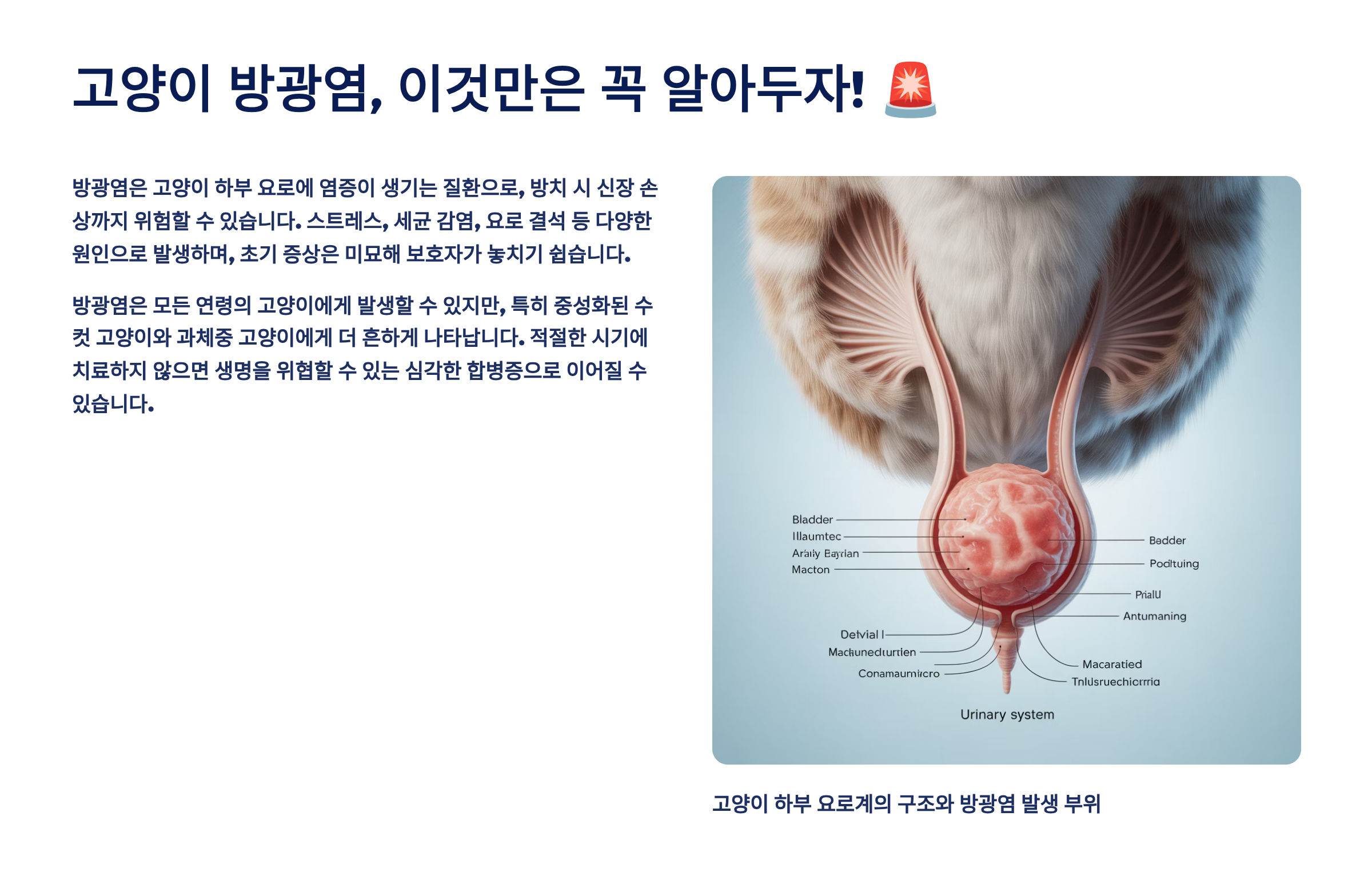고양이 방광염은 방광 내벽에 염증이 생기는 질환으로, 정식 명칭은 '고양이 하부요로기계 질환(FLUTD)'이에요. 이 질병은 나이와 성별에 관계없이 모든 고양이에게 발생할 수 있지만, 특히 중성화한 수컷 고양이, 실내 생활을 하는 고양이, 과체중 고양이에게서 더 자주 나타납니다.