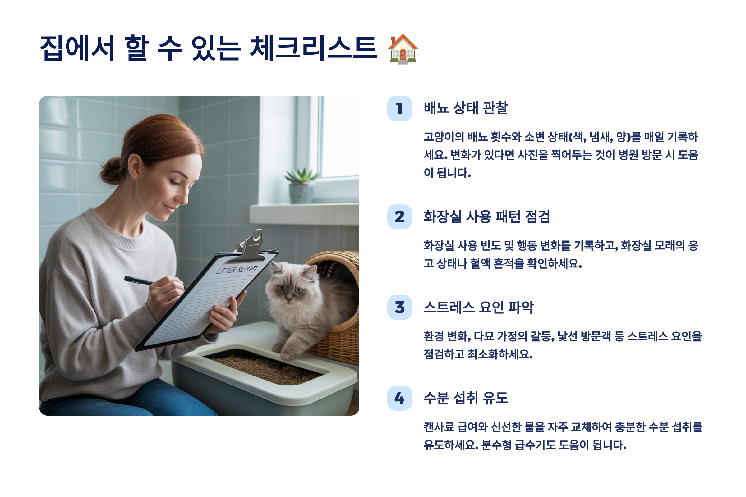 고양이의 방광염을 조기에 발견하고 적절히 대처하기 위해서는 집에서 할 수 있는 체계적인 관찰이 필요해요. 다음 체크리스트를 통해 우리 아이의 상태를 정확히 파악하고, 병원 방문 시 수의사에게 유용한 정보를 제공할 수 있습니다.