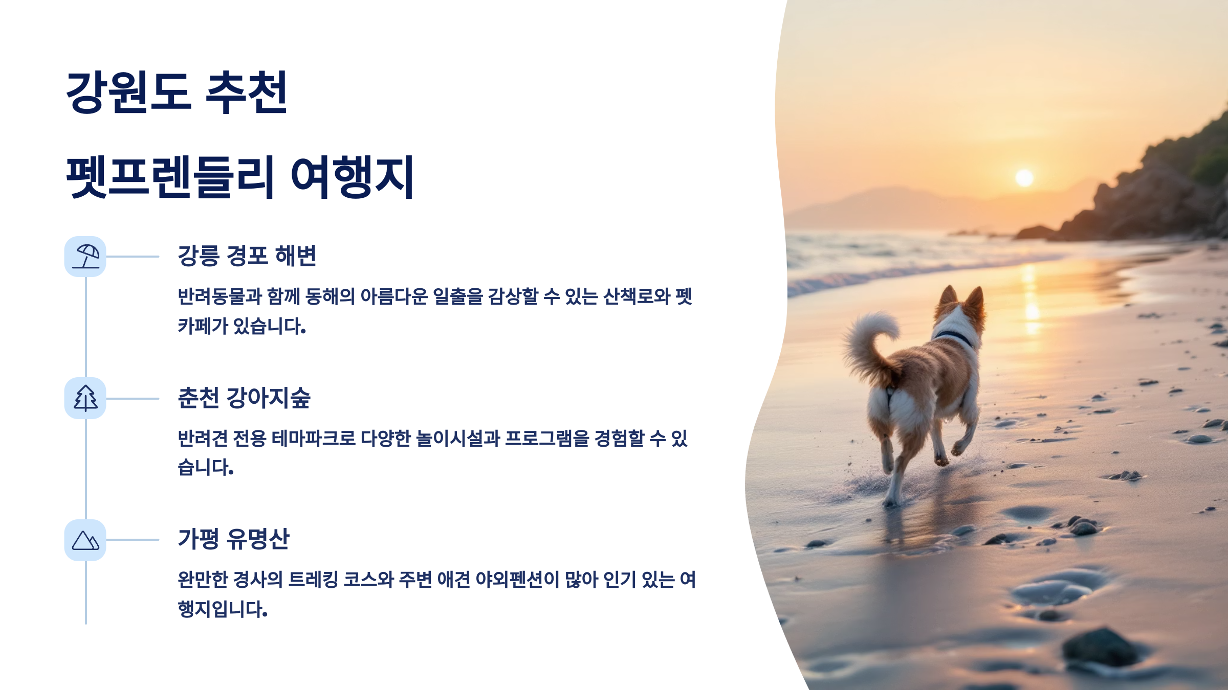 이제 수도권 추천 여행지를 알아봤으니, 다음은 ⛰️ 강원도 추천 펫프렌들리 여행지로 넘어가서 자연 속 명소를 소개할게!