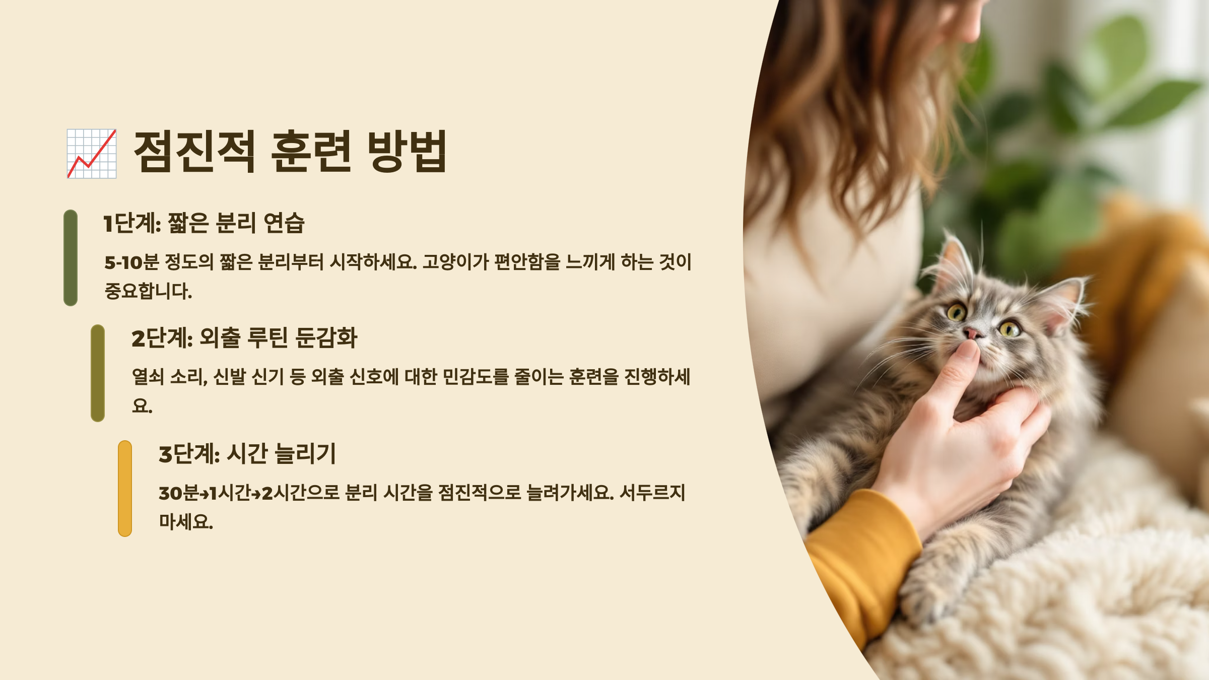 점진적 훈련은 시간이 걸리지만 가장 확실한 방법이에요. 고양이의 속도에 맞춰 천천히 진행하면 반드시 좋은 결과를 얻을 수 있답니다! 🎯