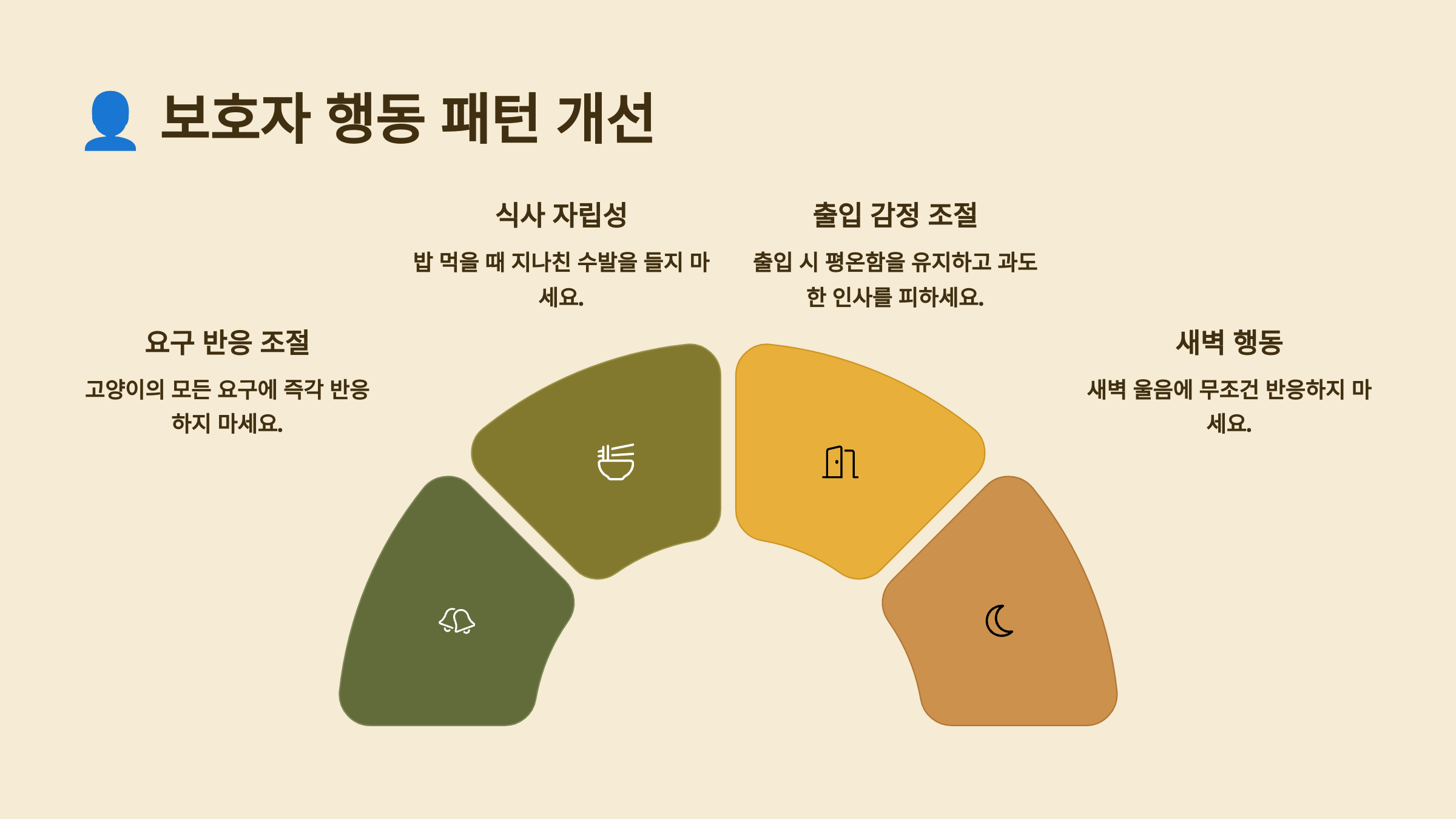 분리불안 해결에서 보호자의 행동 변화는 매우 중요한 요소예요. 많은 경우 무의식적인 보호자의 행동이 고양이의 불안을 더욱 심화시키기도 하거든요. 특히 외출하거나 귀가할 때의 행동 패턴을 바꾸는 것이 핵심이에요. 과도한 관심이나 감정적인 반응은 오히려 고양이에게 '외출=특별한 일'이라는 인식을 심어줄 수 있어요.