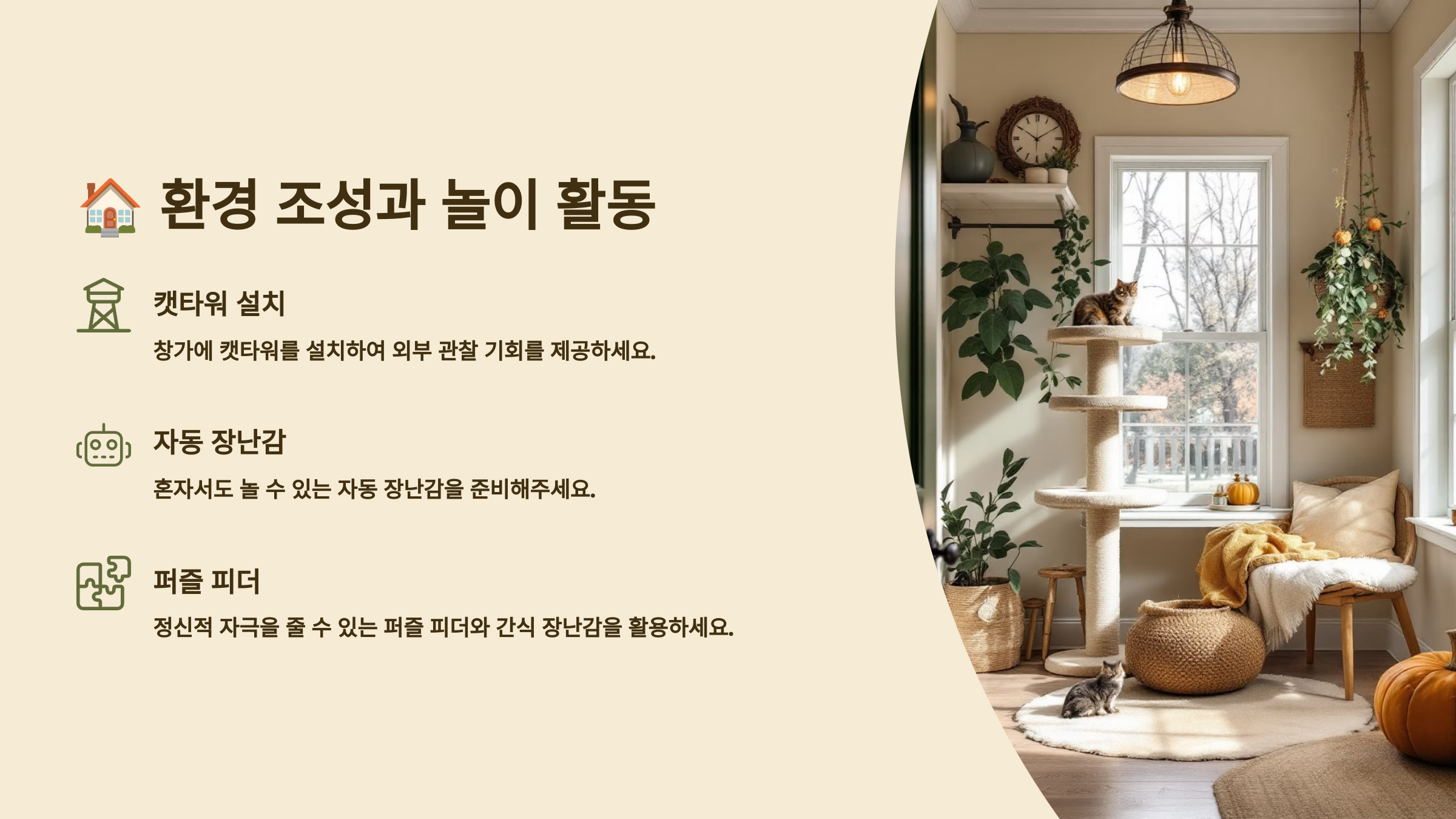 | 수직 공간 | 캣타워, 선반 설치 | 안정감 제공 |