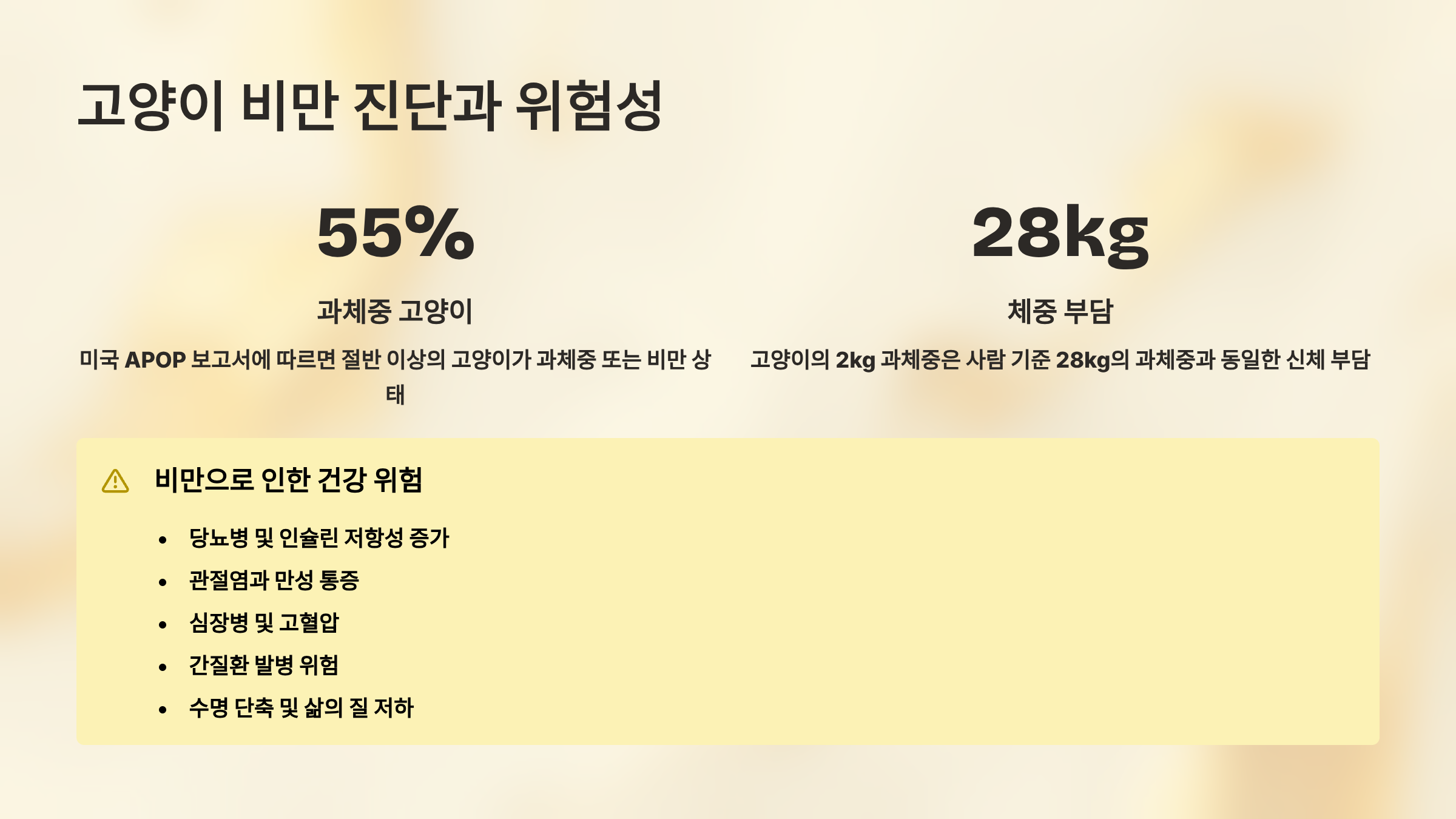 비만이 위험한 이유는 단순히 움직임이 둔해지는 것 때문만이 아니에요. 축적된 지방은 염증성 호르몬을 분비하고 신체 조직에 산화 스트레스를 생성합니다. 이로 인해 관절염, 당뇨병, 심장병, 지방간, 비뇨기 질환 등 거의 모든 질병의 발생 위험이 높아져요.
