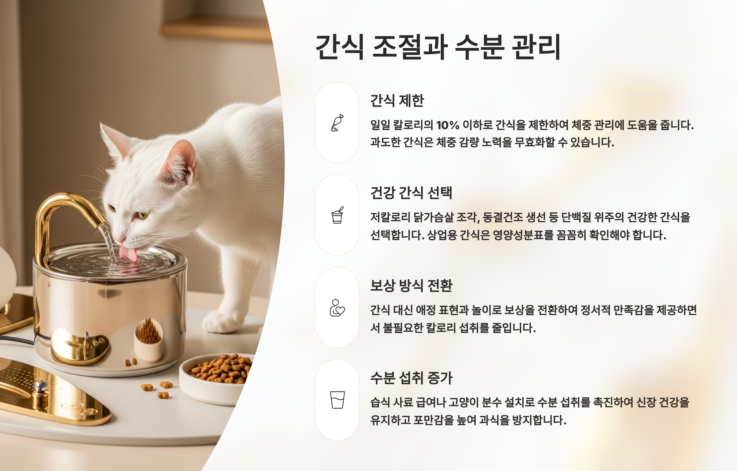 수분 섭취는 다이어트의 핵심이에요. 충분한 수분은 신진대사를 활발하게 하고 포만감도 줍니다. 하루 체중 1kg당 40~60ml의 물을 마시는 것이 이상적이에요. 5kg 고양이라면 200~300ml 정도죠.