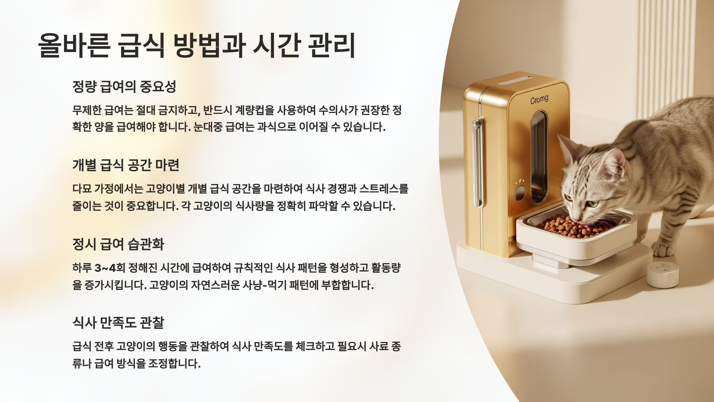 다묘 가정이라면 더 세심한 관리가 필요해요. 비만 고양이와 다른 고양이들의 식사 공간을 분리하거나, 높낮이를 다르게 해서 비만 고양이가 올라가기 어렵게 만드는 것도 방법입니다. 마이크로칩 인식 급식기를 사용하면 각자 정해진 양만 먹을 수 있어 편리해요.