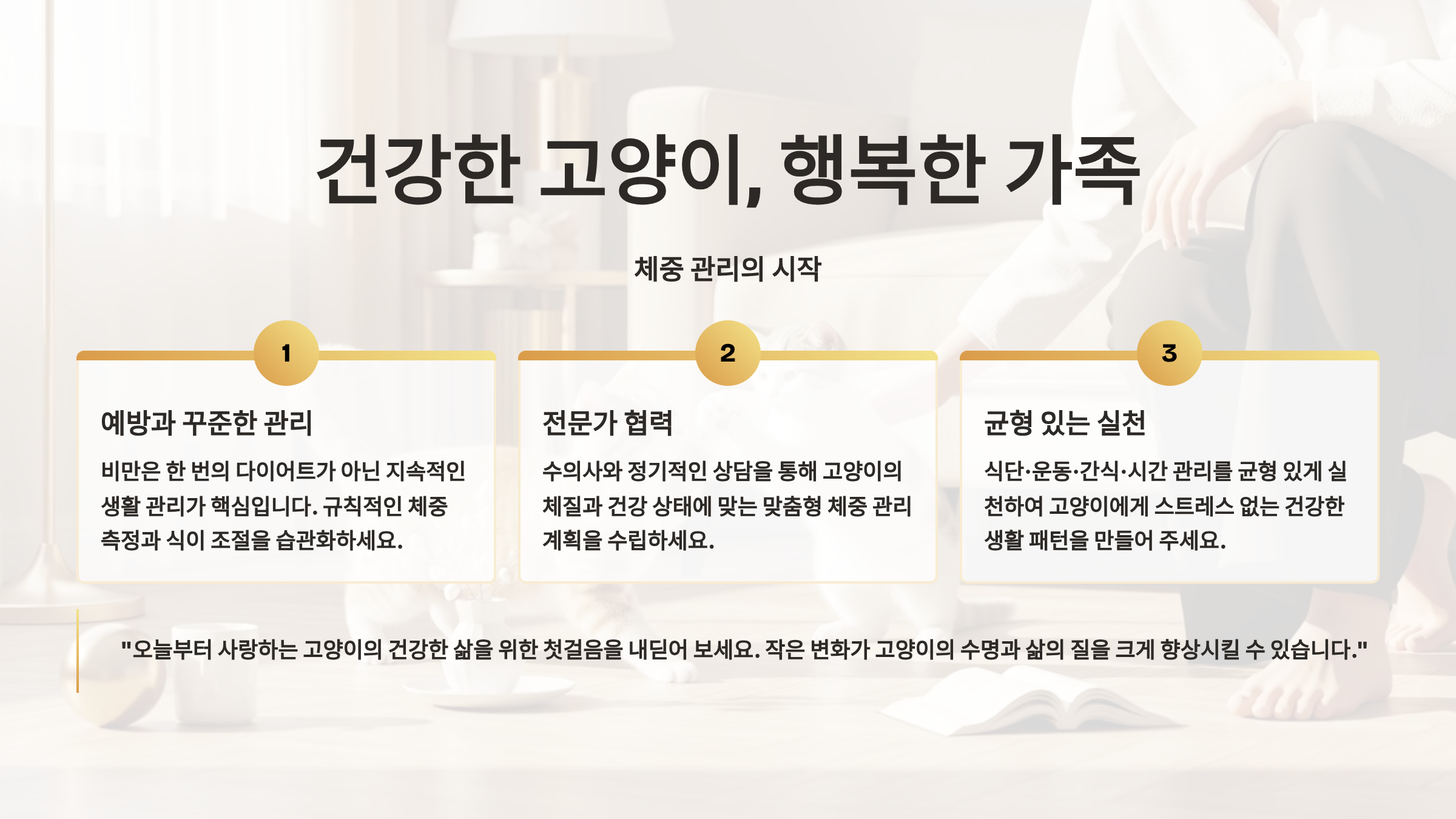 성공적인 고양이 다이어트의 핵심은 천천히, 꾸준히, 안전하게 진행하는 것이에요. 한 달에 체중의 1~2% 감량을 목표로 하고, 절대 굶기지 마세요. 식단 관리, 운동, 스트레스 관리가 균형 있게 이뤄져야 합니다.