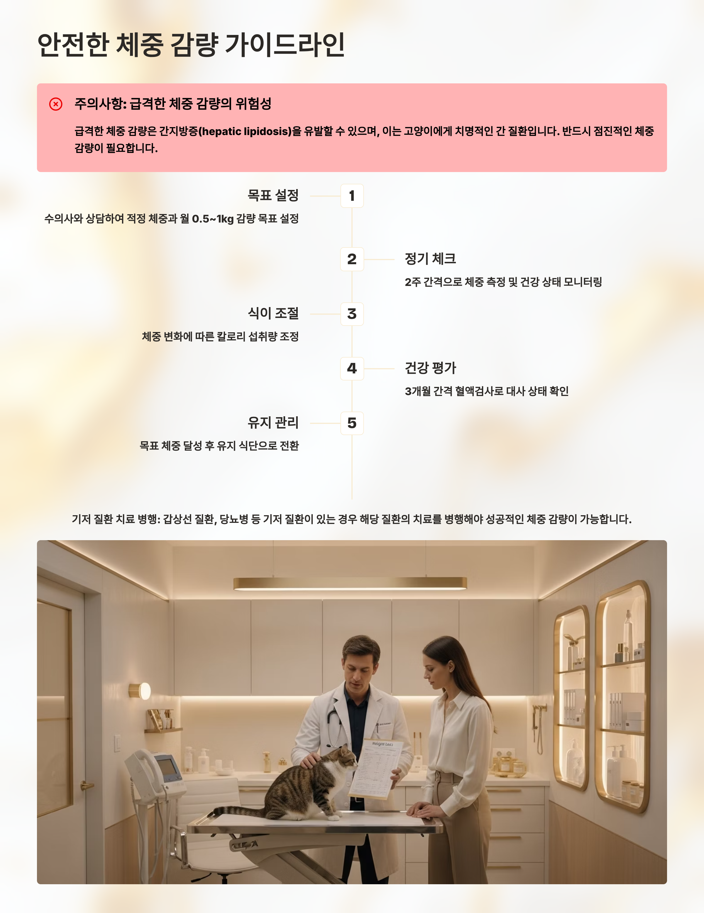 비만 진단을 받았다면 당황하지 마세요. 체계적인 관리로 충분히 건강한 체중으로 돌아갈 수 있어요. 다만 고양이는 2~3일만 굶어도 지방간이 올 수 있으니 절대 굶기면 안 됩니다! 🚨