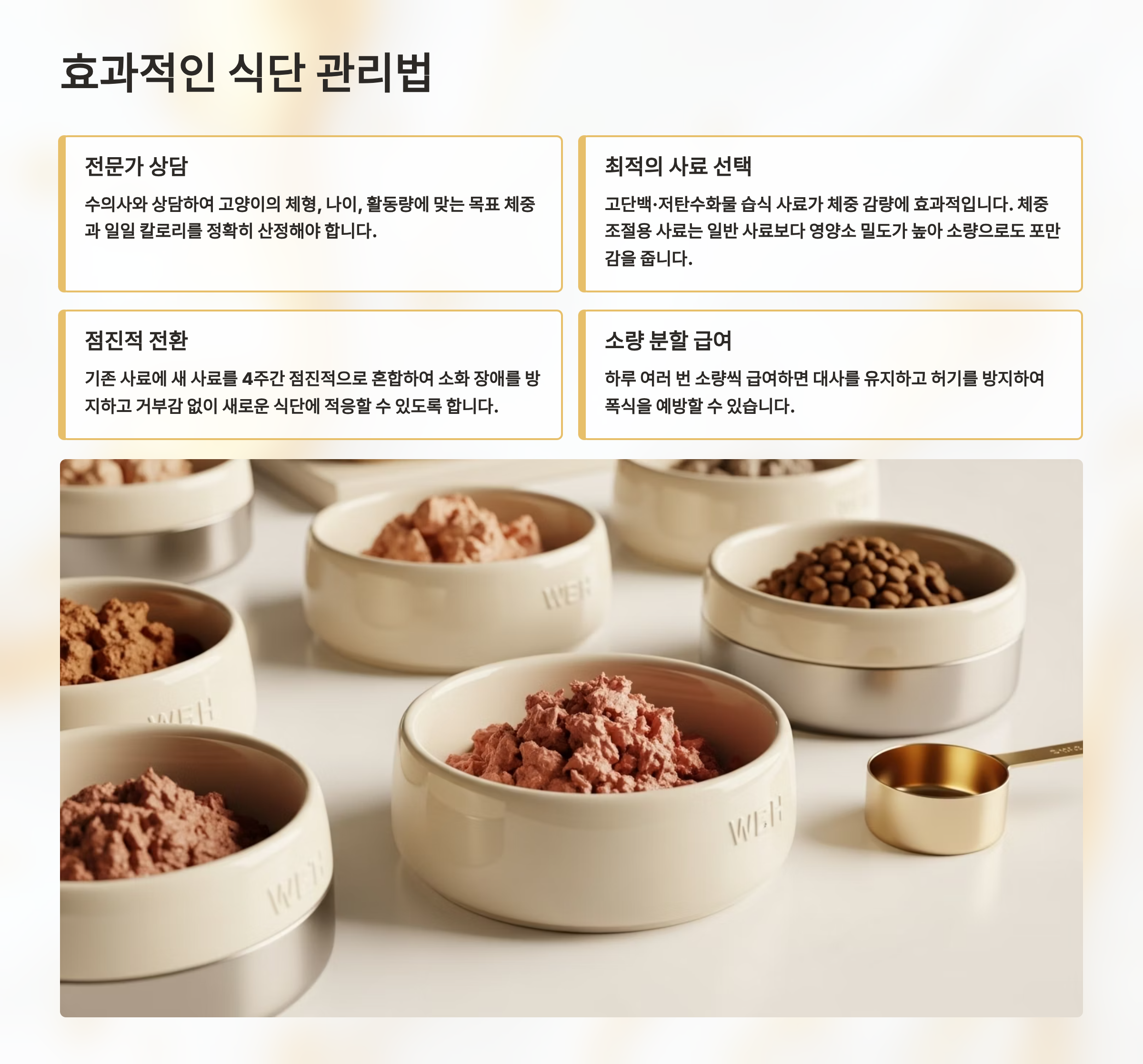 급여량 조절은 점진적으로 해야 해요. 갑자기 사료를 확 줄이면 스트레스를 받고 음식에 대한 집착이 더 심해질 수 있습니다. 일주일에 10% 정도씩 천천히 줄여나가는 것이 이상적이에요.