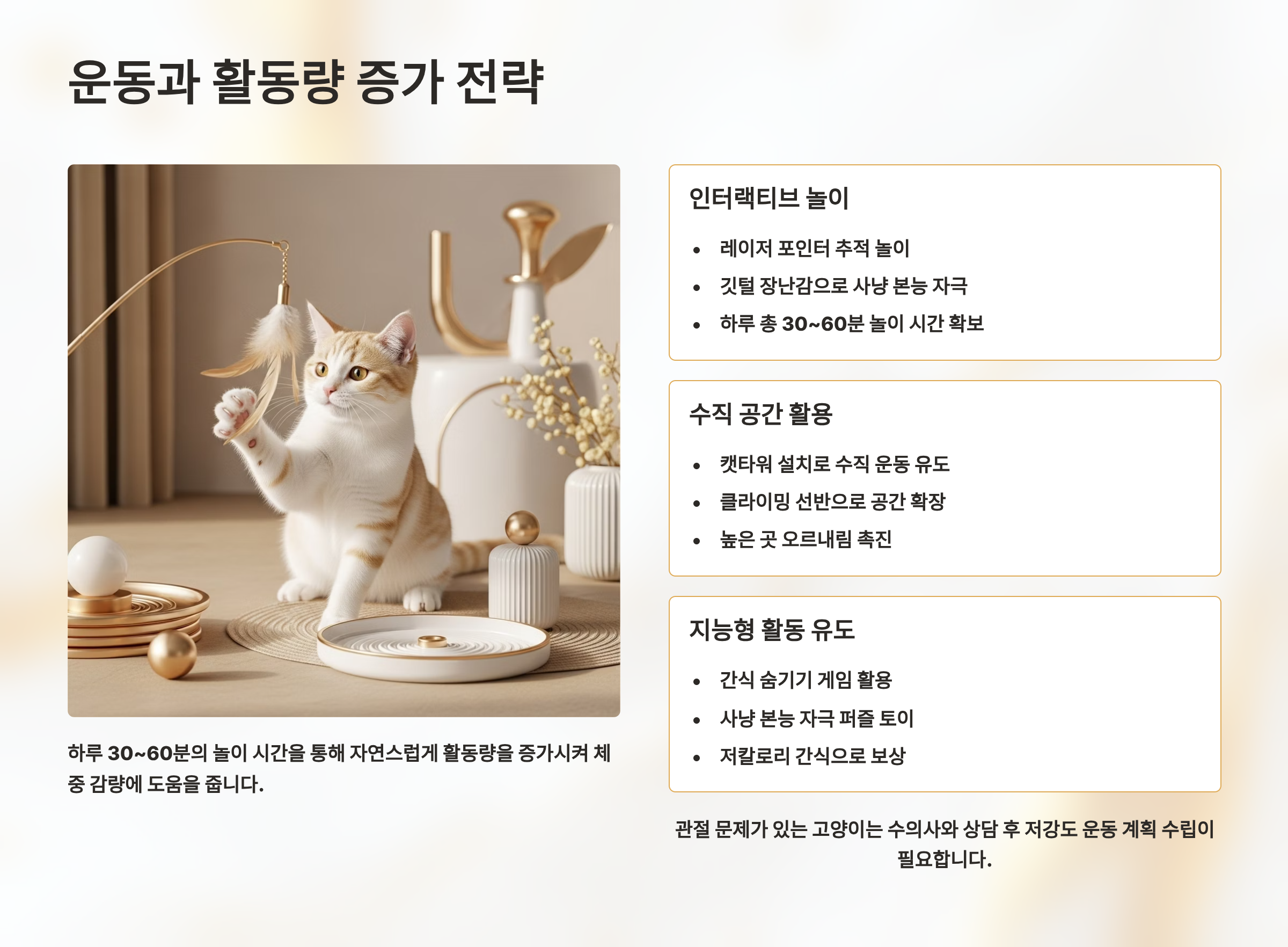 고양이 다이어트에서 운동은 필수예요! 하루 최소 15분씩 2회 이상 놀아주는 것을 목표로 하세요. 처음엔 1~2분의 짧은 놀이부터 시작해도 괜찮아요. 중요한 건 꾸준함입니다.