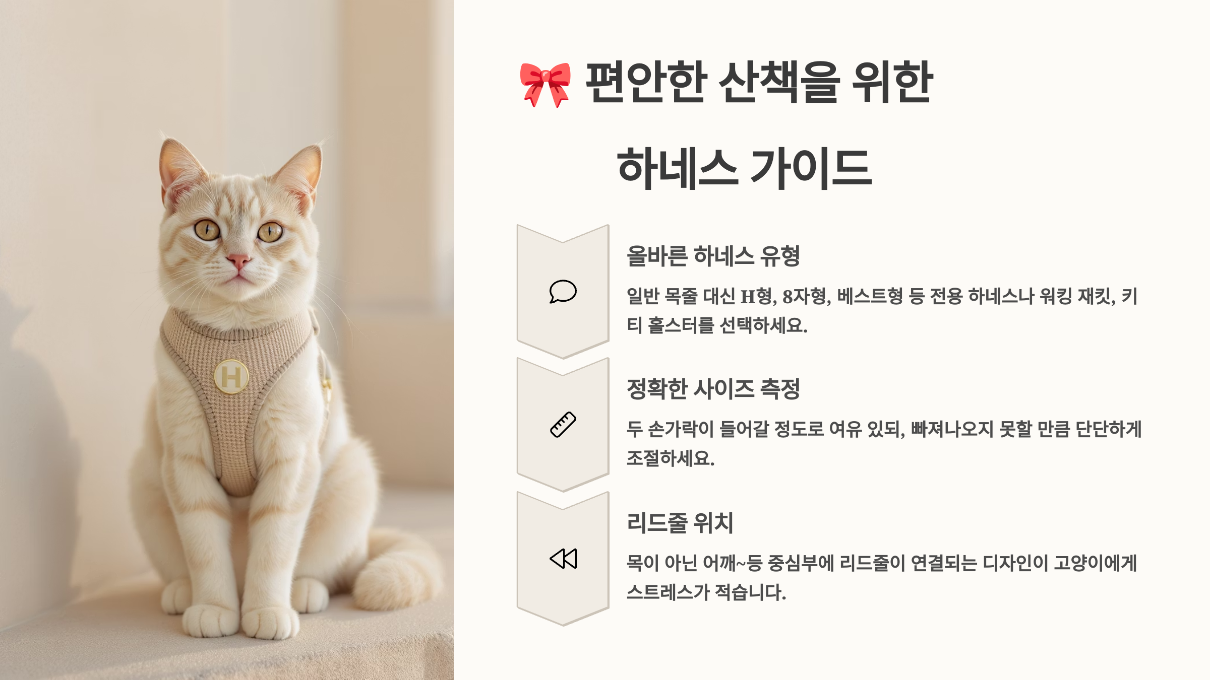고양이 하네스는 안전한 산책을 위한 필수 아이템이에요. 목줄과 달리 하네스는 압력을 분산시켜 고양이의 목과 기도를 보호해줘요. 특히 고양이는 몸이 유연해서 일반 목줄로는 쉽게 빠져나갈 수 있기 때문에 하네스가 훨씬 안전해요. 하지만 모든 고양이가 하네스를 좋아하는 것은 아니므로 천천히 적응시키는 과정이 필요하답니다.