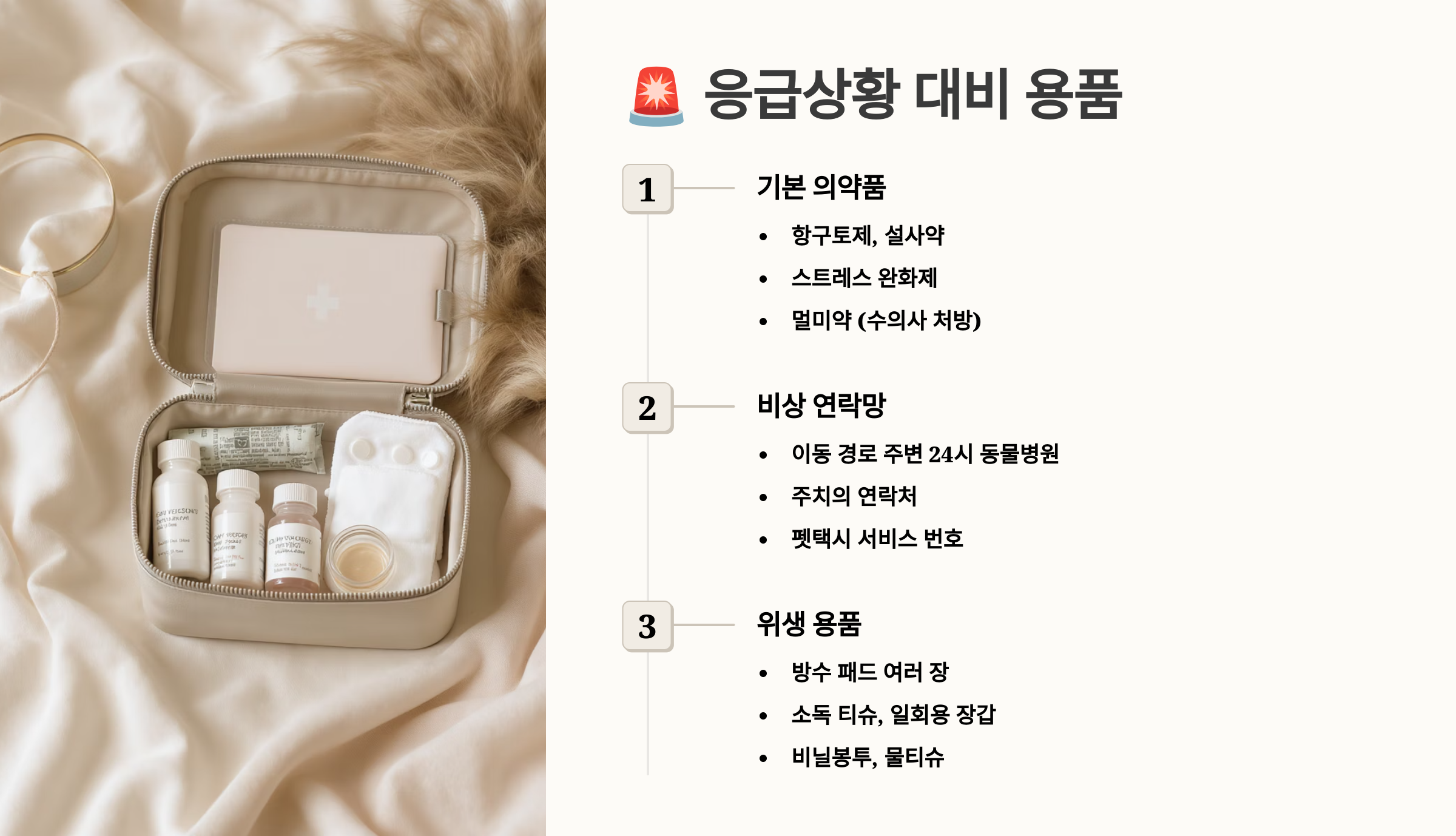 응급 약품도 준비하세요. 수의사와 상담 후 비상약을 처방받을 수 있어요. 멀미약, 지사제, 항히스타민제(알레르기 대비) 등이 유용해요. 평소 복용하는 약이 있다면 여분을 준비하고, 약 이름과 용량을 메모해두세요. 인간용 약품은 절대 임의로 사용하면 안 돼요.